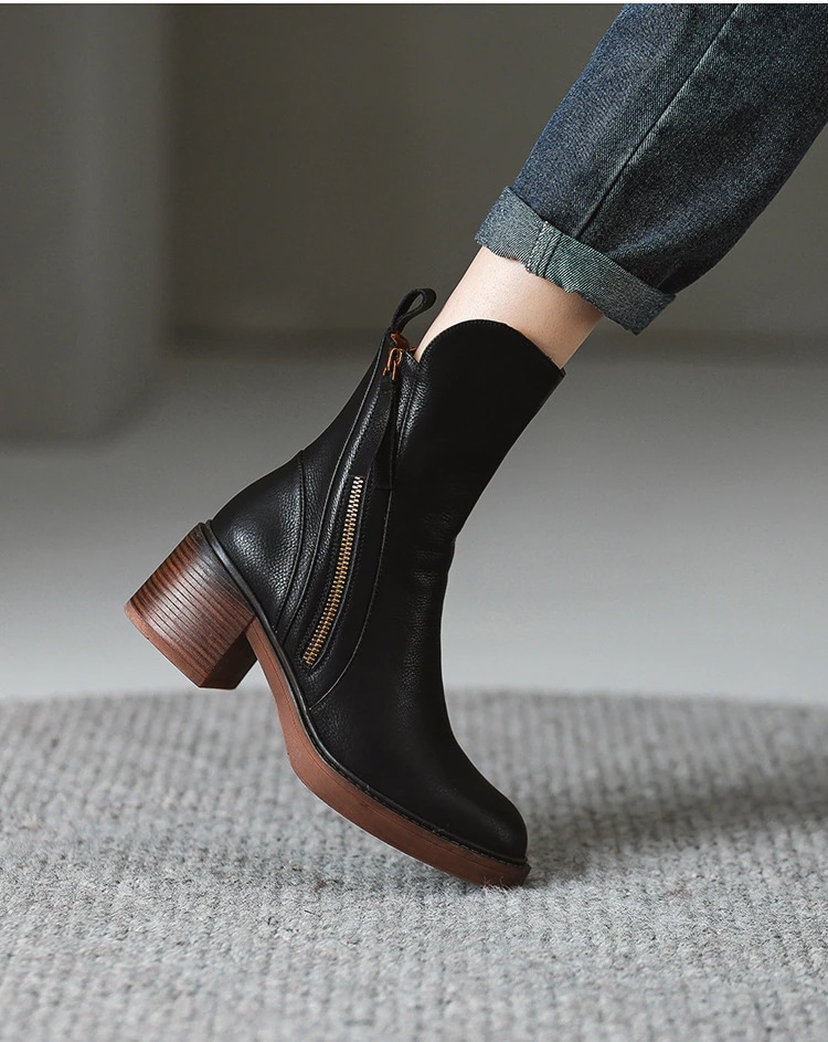 レトロなミドル丈サイドジッパー付きマーチンブーツ 新作ヨーロッパスタイルの太ヒールおしゃれトレンドファッションレディースブーツ ショートブーツ