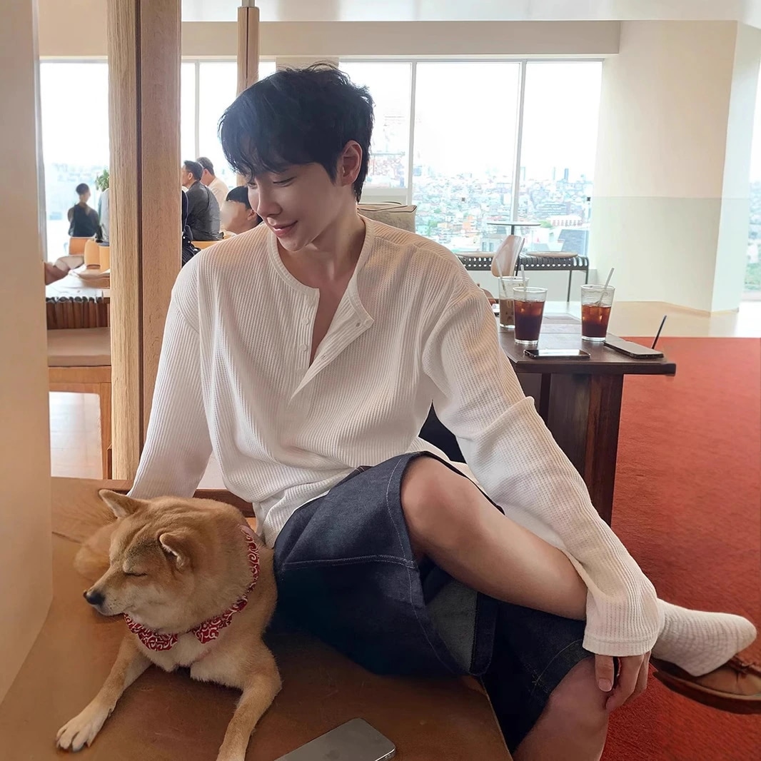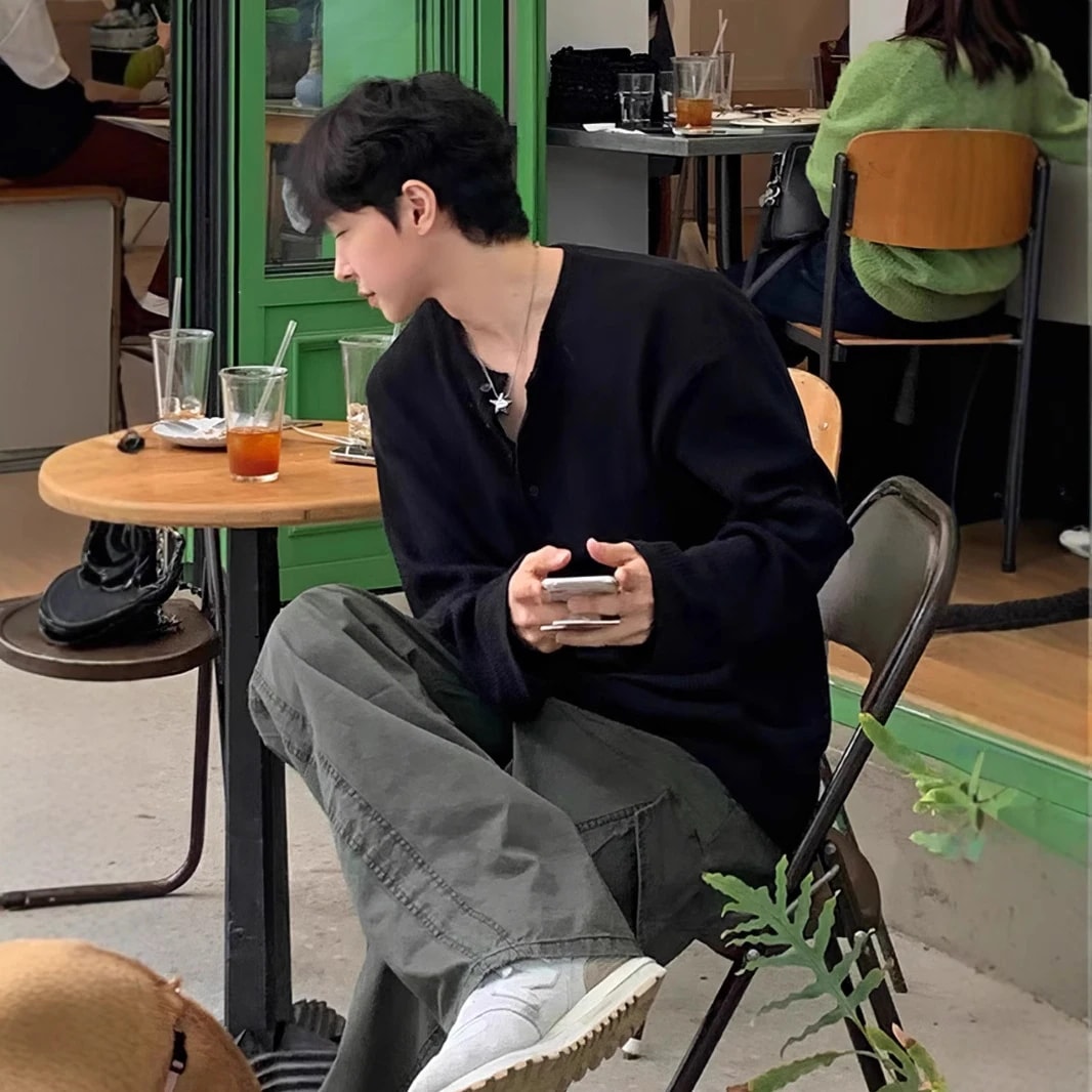 高級感ある立て襟ストライプ長袖Tシャツ(男性用) 春秋用 韓国風カジュアルゆったり無地Tシャツ その他のトップス