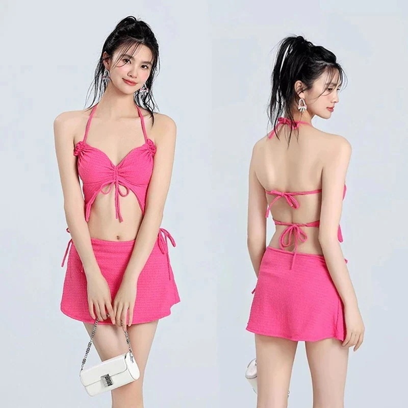 水着 レディース 2026新リゾートビーチins薔薇色ビキニ3点セット水着女性小胸ネット赤セクシー 温泉水着 体型カバー ワンピース水着