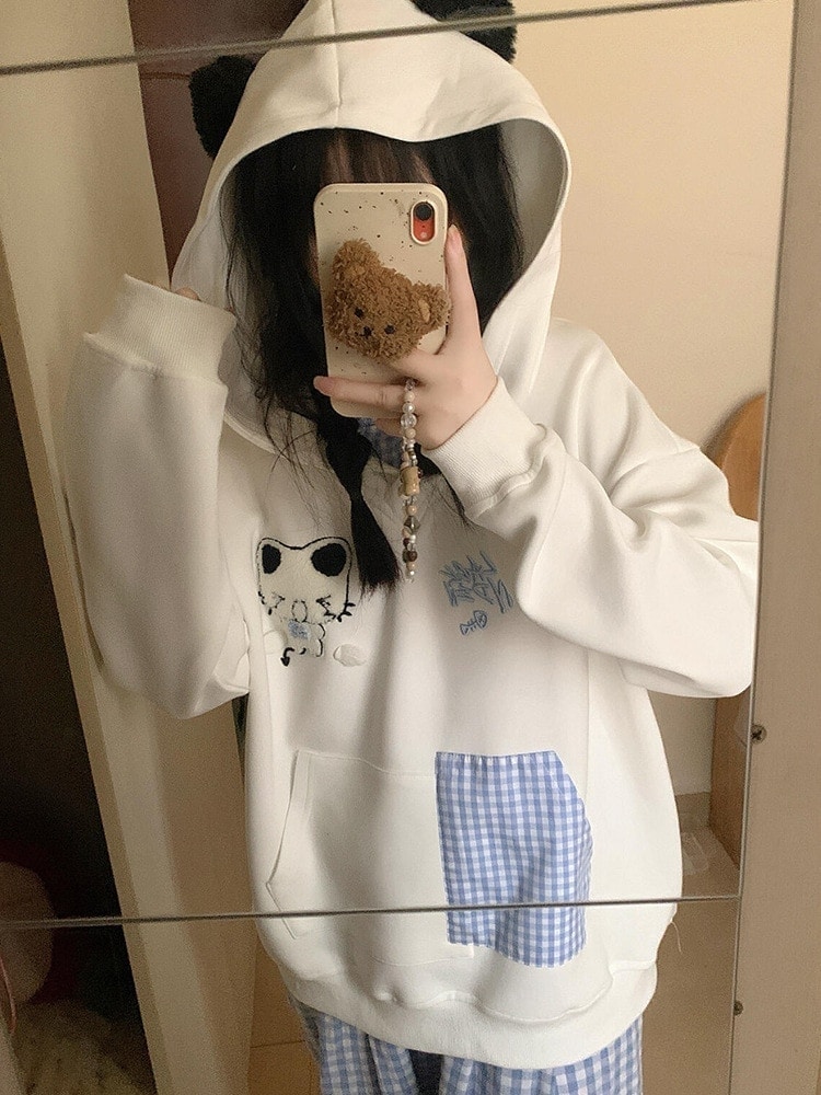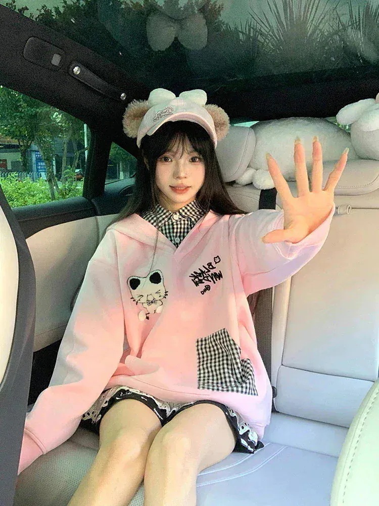 パーカー ゆったり スウェット 秋新作かわいい猫刺繍フード付きスウェットシャツ レトロチェックパッチワークフェイクツーピースフード付きスウェット 韓国ファッション