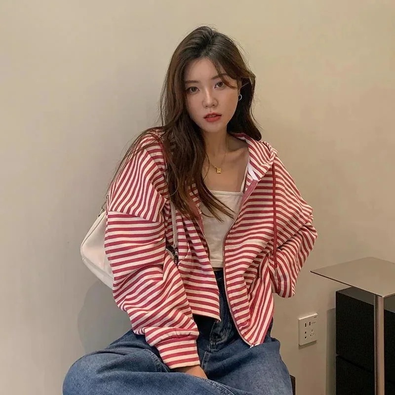 春 アウター カジュアル百掛け パーカー レディース 韓国ファッション ストライプ 長袖トップス 怠惰な風 薄 ショートアウター 着痩せ UVカット