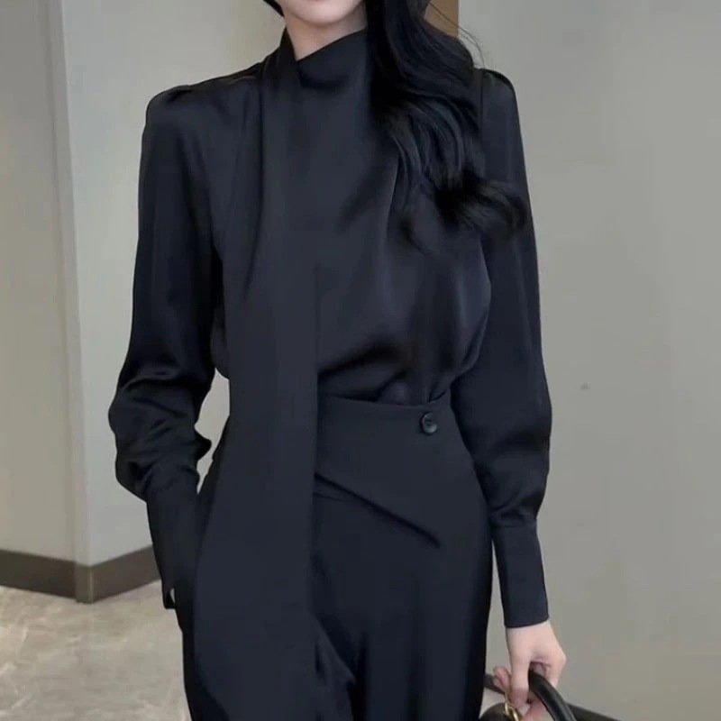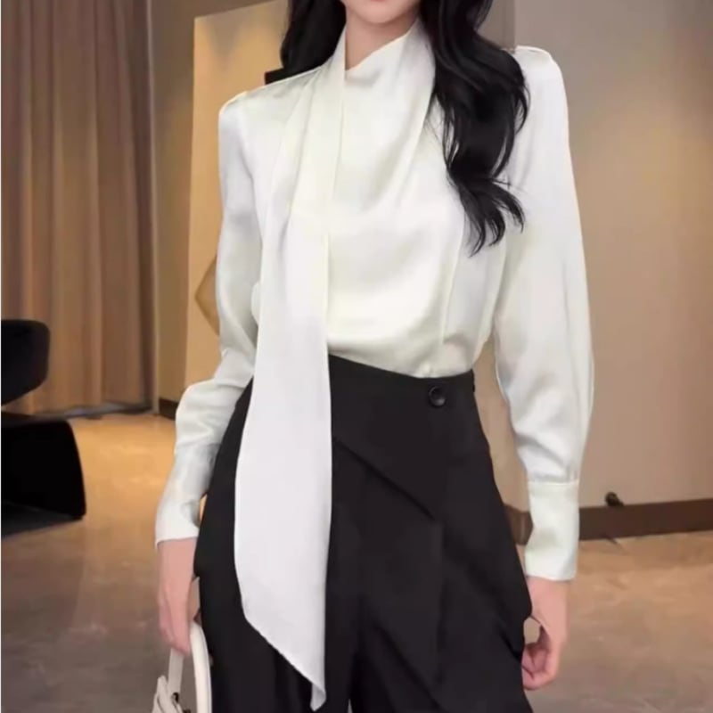 リボン付きサテン長袖シャツ女性用 2025年秋新作高級感ある上品なデザインスタイルを美しく見せる万能アイテム通勤になトップス