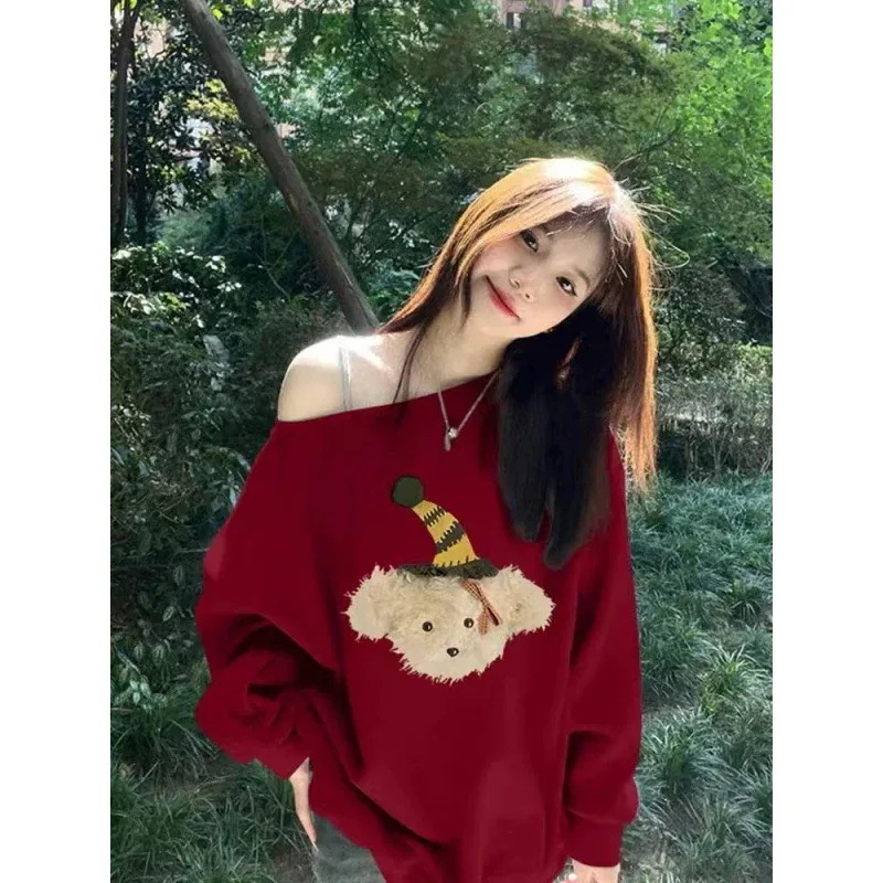 スウェット アメリカン風 キャラクター ワンショルダー 長袖 スウェットシャツ 女性用 秋冬用 裏起毛 ゆったり トップス