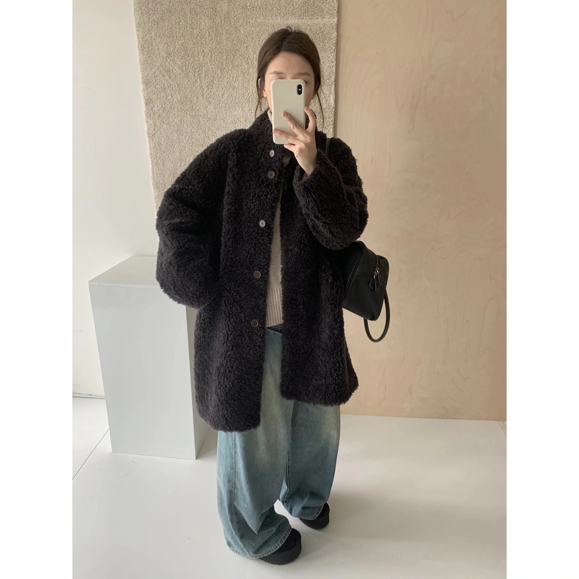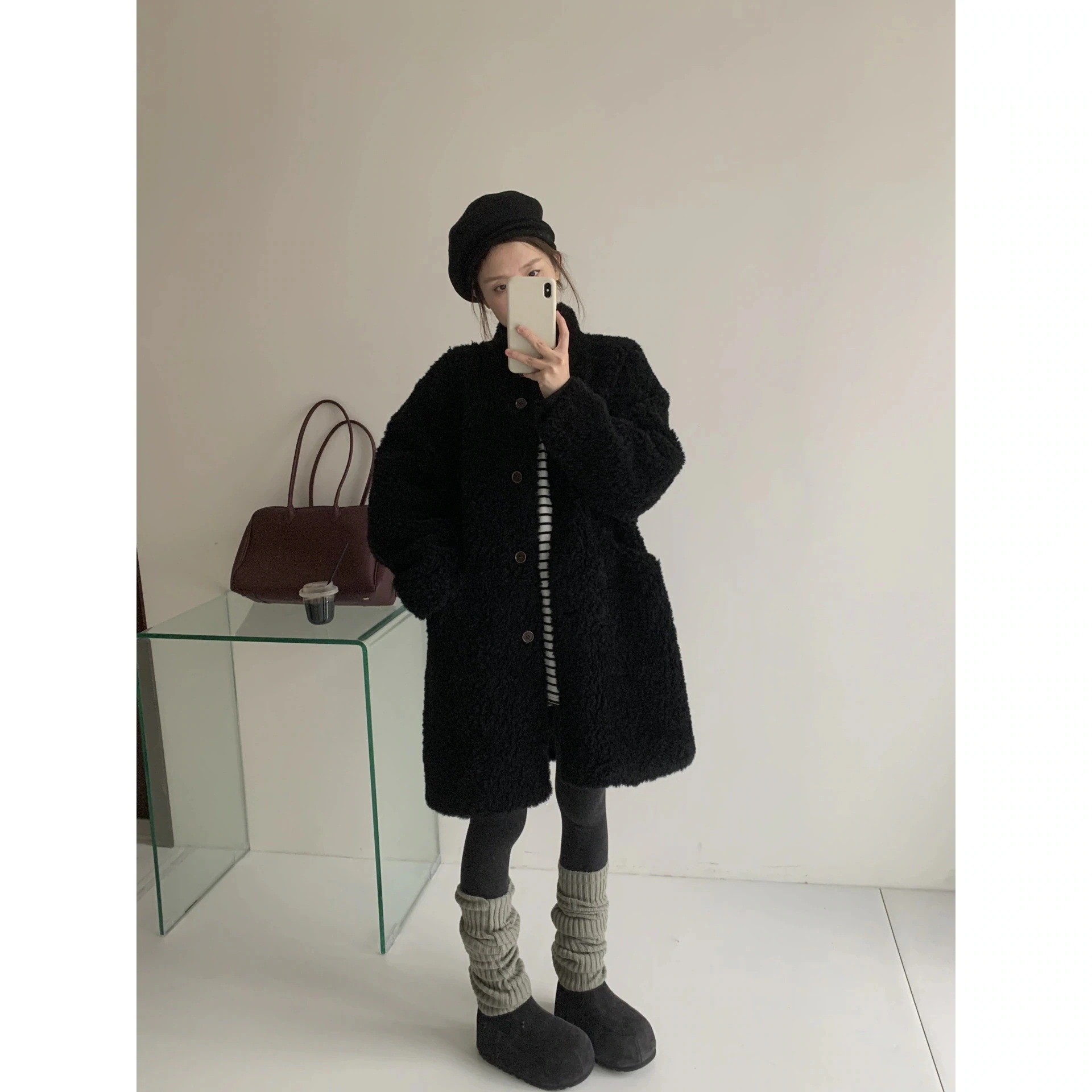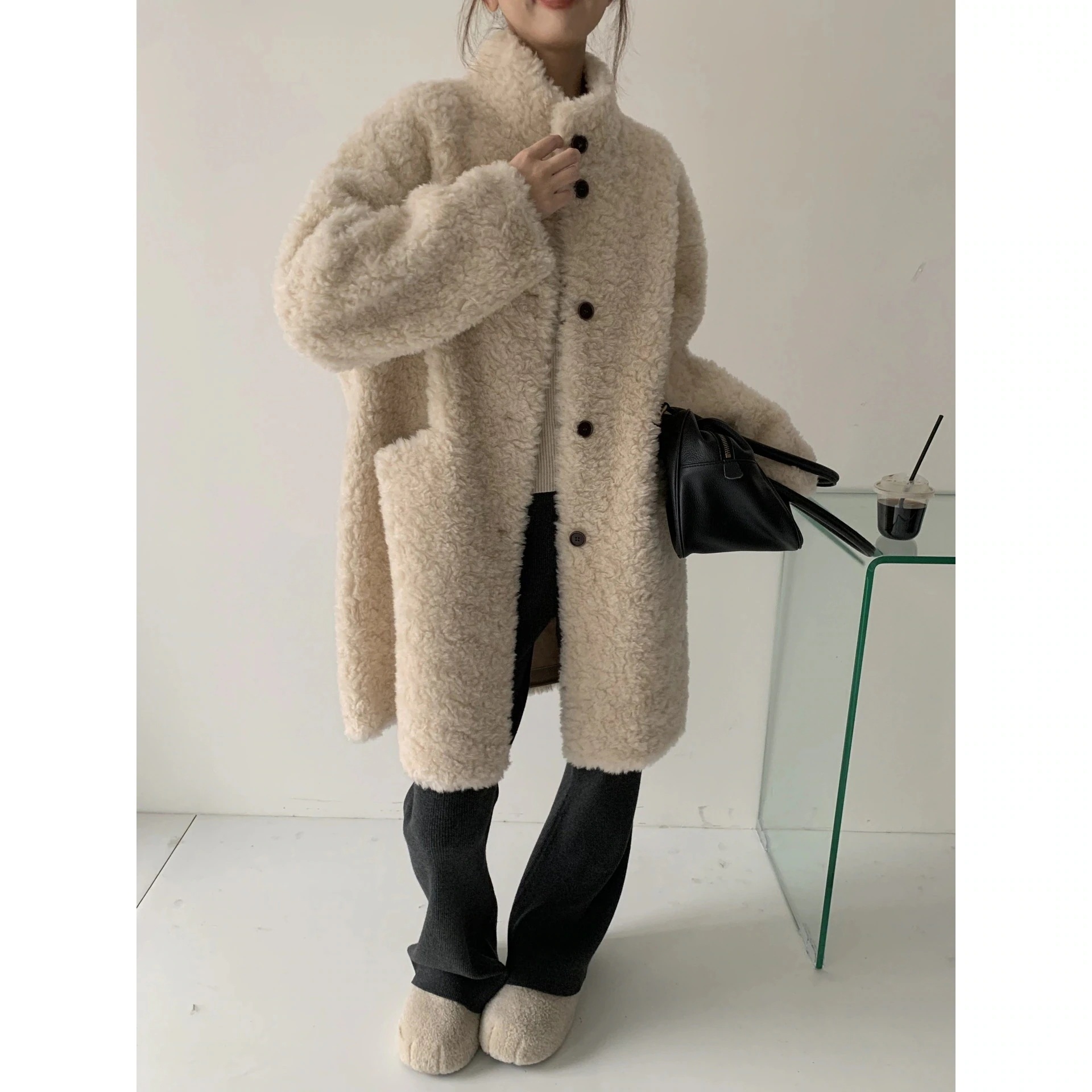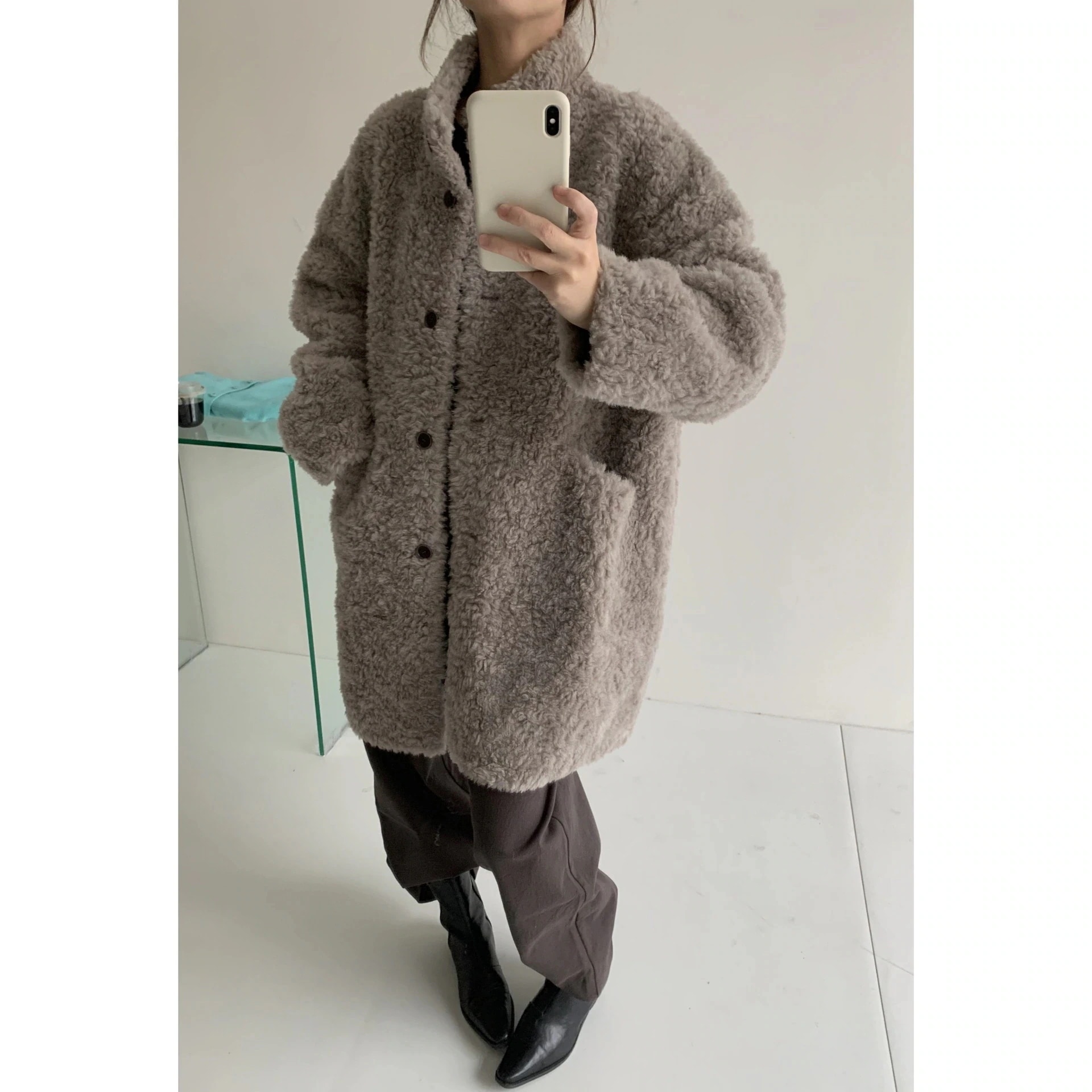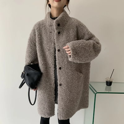 ラフなスタイル 韓国風新作 ラムファーコート レディース ミドル丈 冬のファーコート スタンドカラー 毛皮一体型