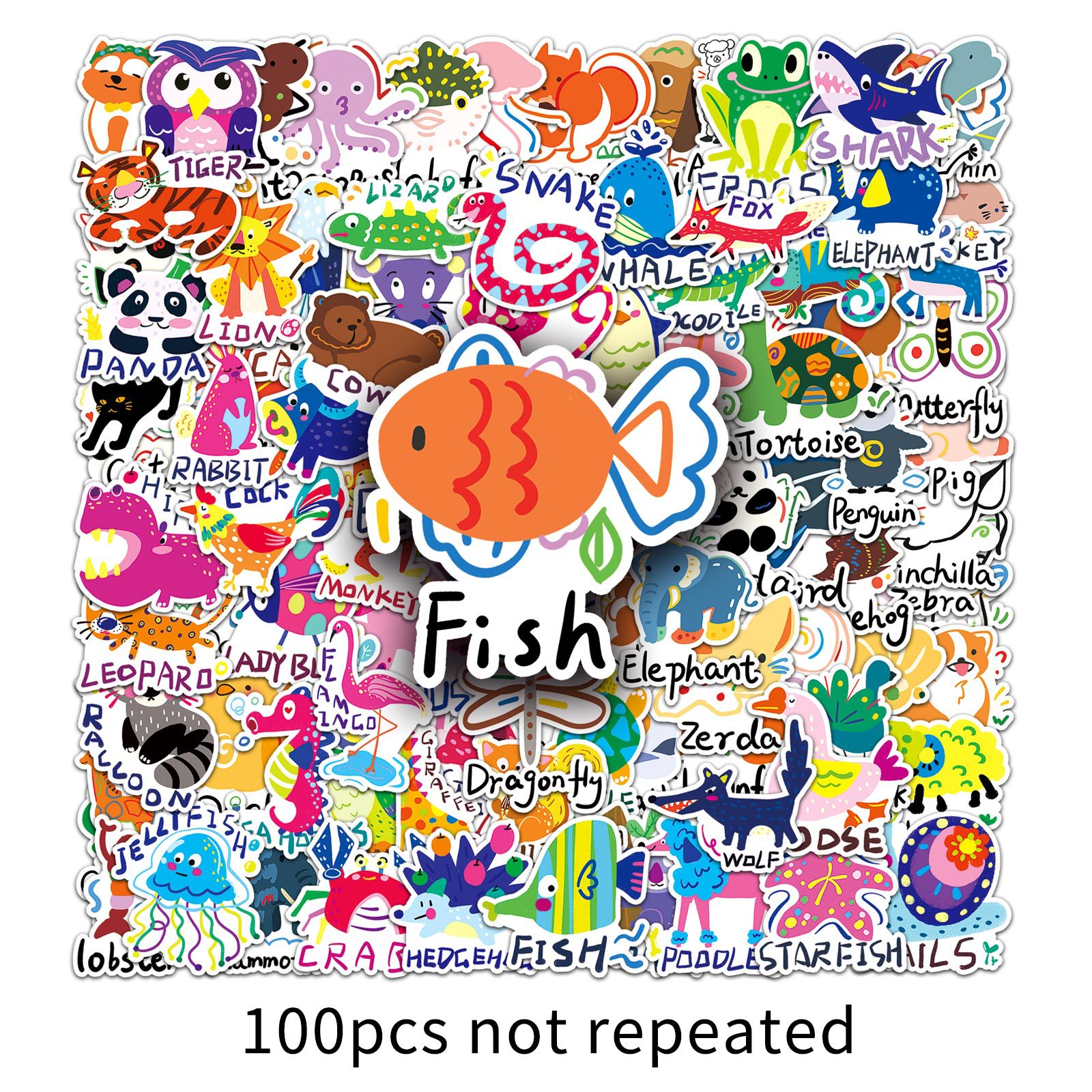 100 枚 カートゥーン動物 英単語グラフィティシール 防水 手帳 / グカ素材 デコレーションシール