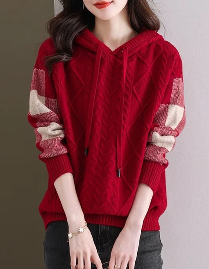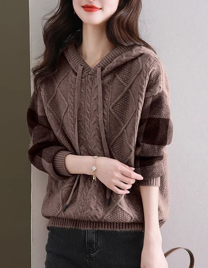 DEMUXIケーブル編みボーダー袖フード付きニット レディース ニット パーカー ケーブル編み ストライプ袖 長袖 体型カバー カジュアル 春 秋 冬 20代 30代 40代 50代 ワンピスター