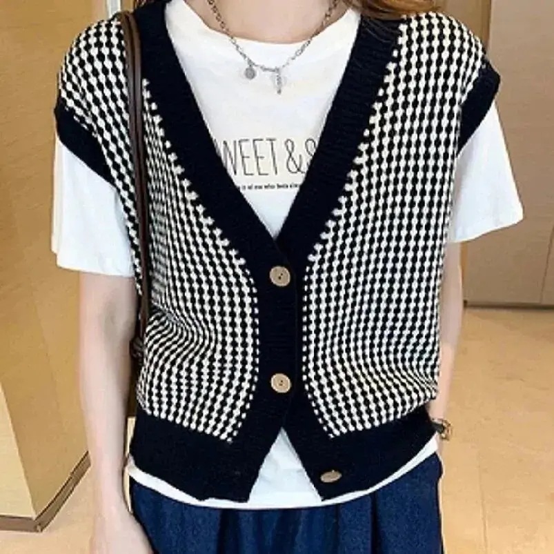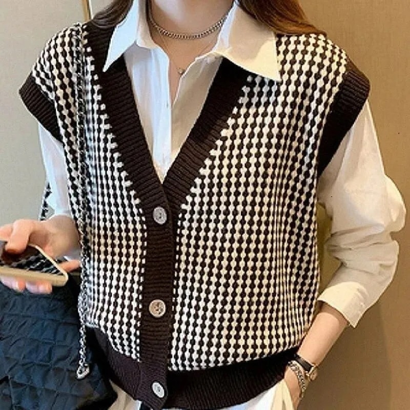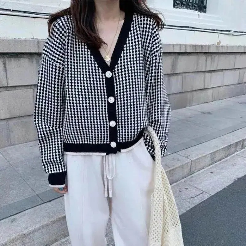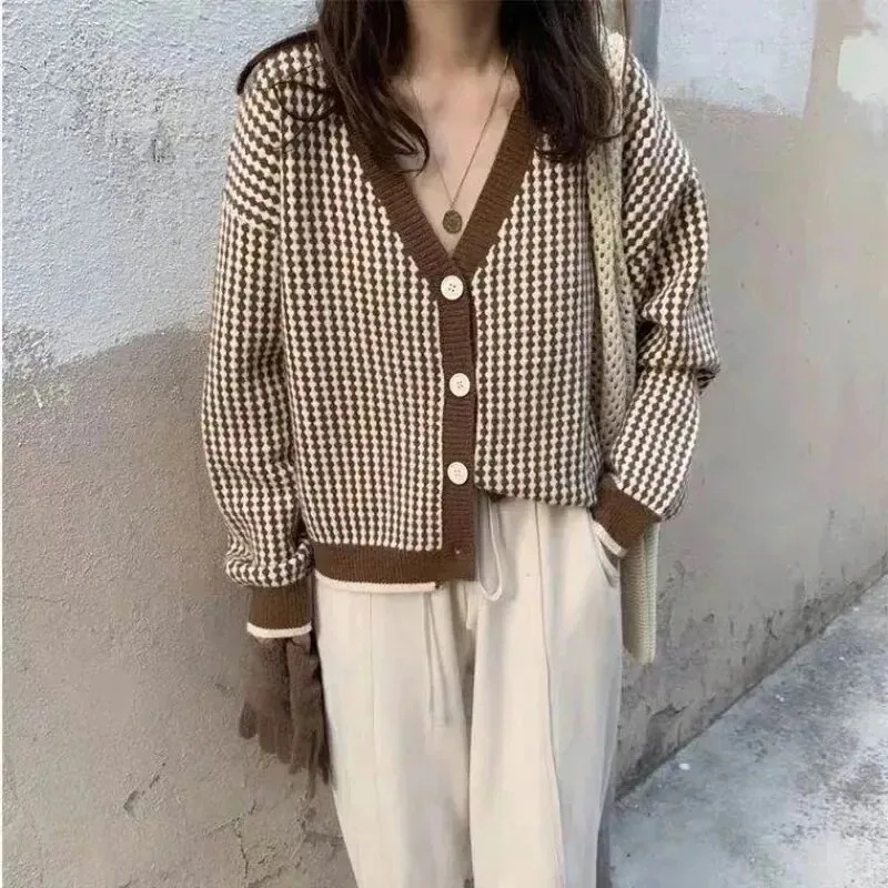 ジャケット 秋 韓国 ニット カーディガン セーター チェック コントラストカラー Vネック ゆったり トップス 万能 カジュアル韓国ファッション 2026福袋 人気なリプニット