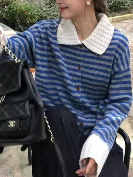 レトロなコントラストストライプ セーター風カジュアルポロネック ニット 合わせやすいデザイン