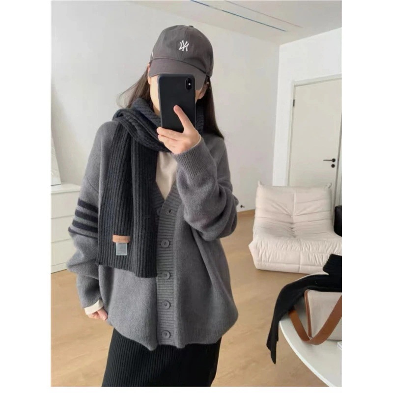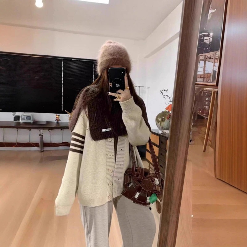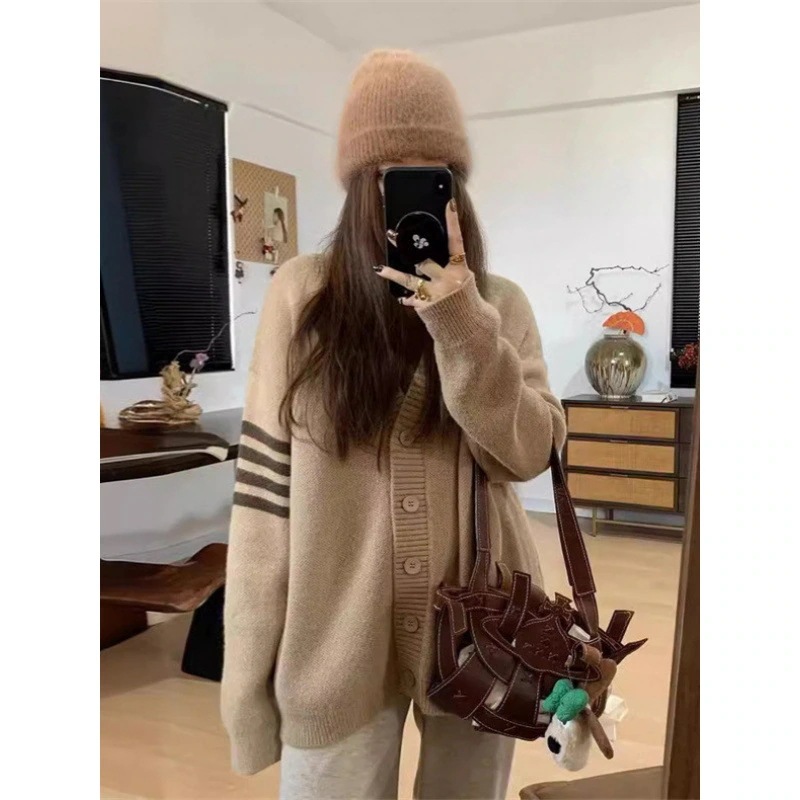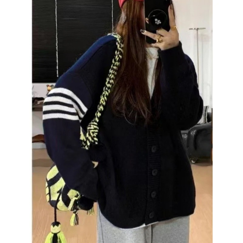 風ストライプVネック スクールスタイル ゆったりニット 新作レディース セーターコート
