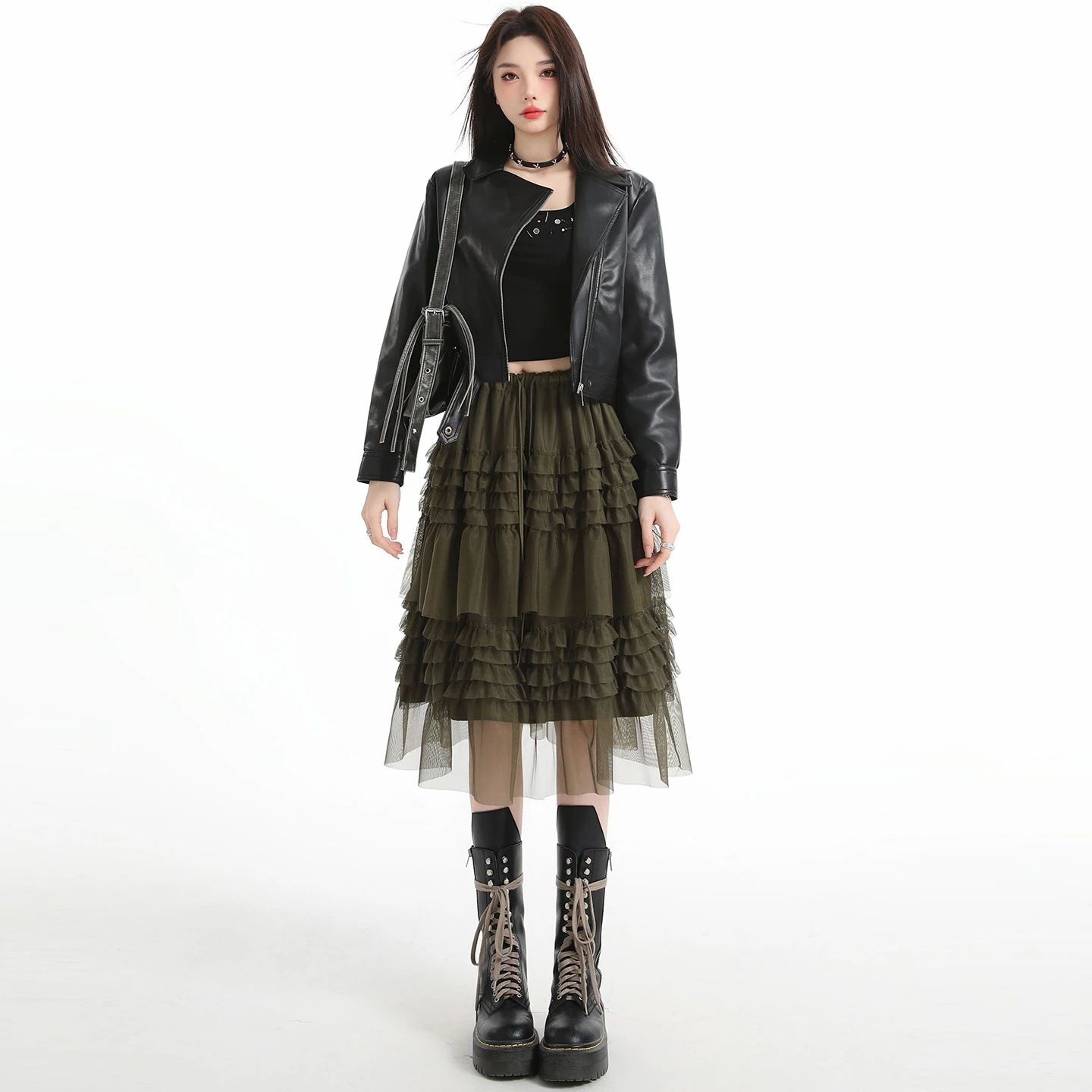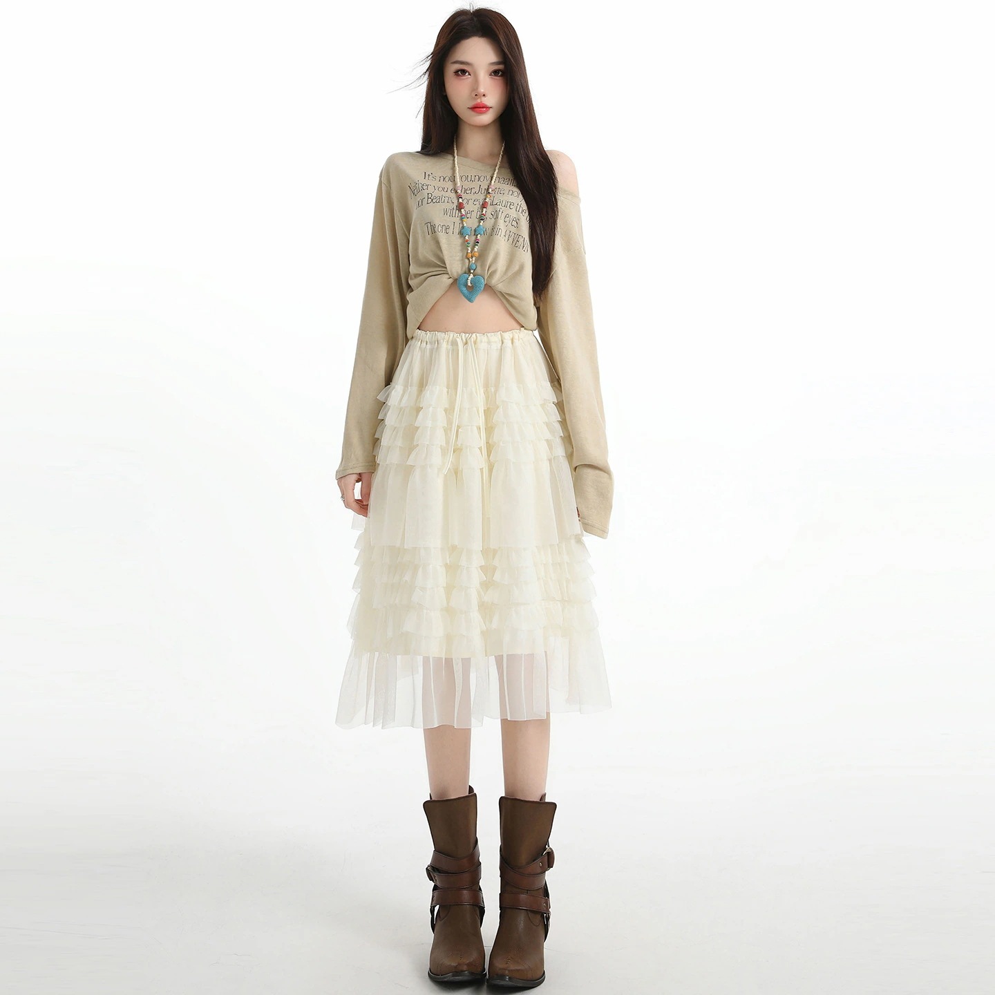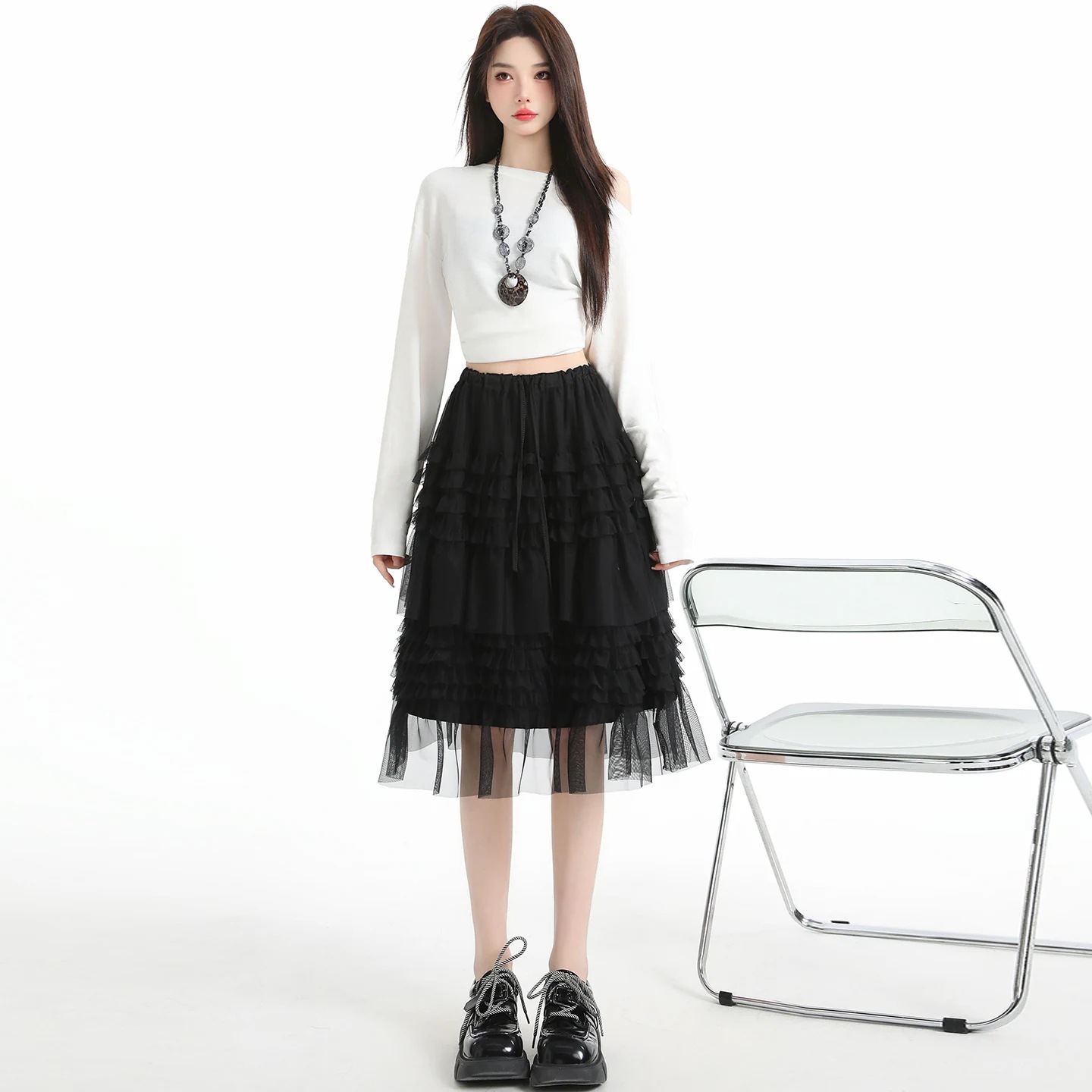 木耳縁にパフスリーブのルを組み合わせたハーフスカート女性用 2026年春 ハイウエストミディ丈スカート