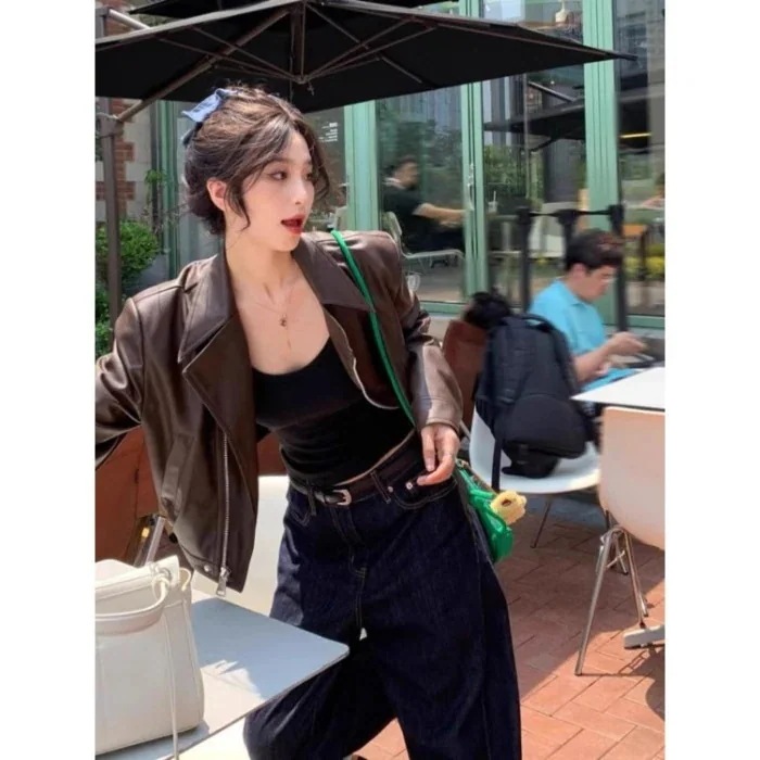カーキ色のレザージャケット女性用 春物 ゆったりシルエット小柄な方におすすめ レトロスタイル 長袖バイカージャケット