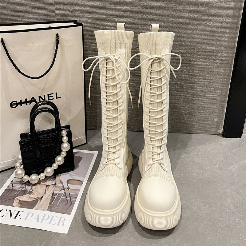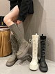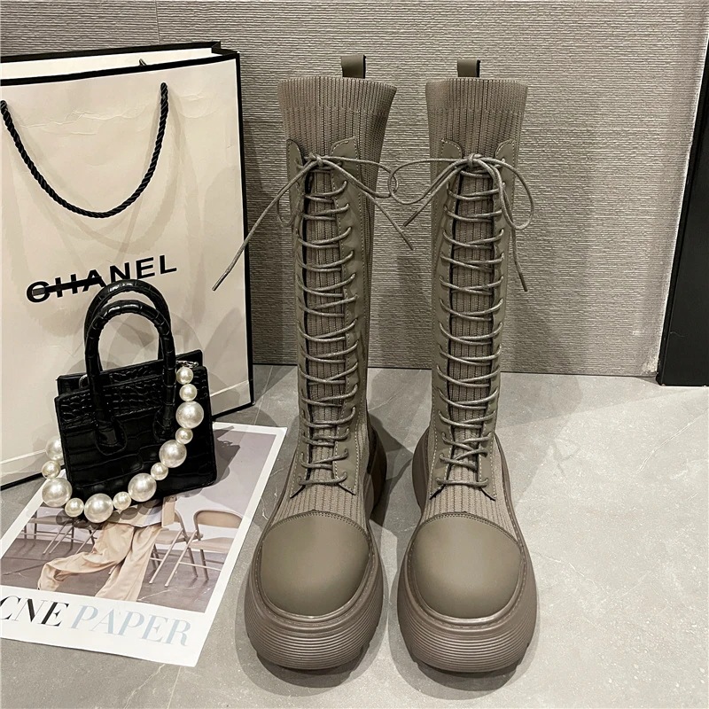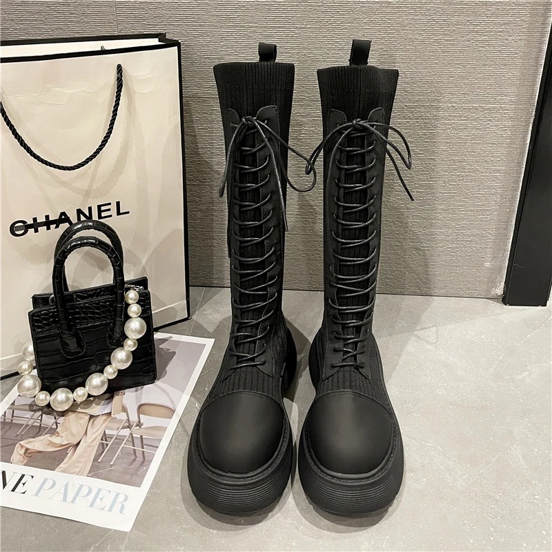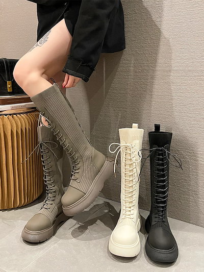 2025 韓国秋冬 リブニット切り替え ロングブーツ 5cmヒール靴 美脚 脚長 色っぽ風 女っぽローヒールカジュアルフェイクきれいめ 大人っぽ 上品 ウエスタンブーツ PUエコゆったり フェミニン