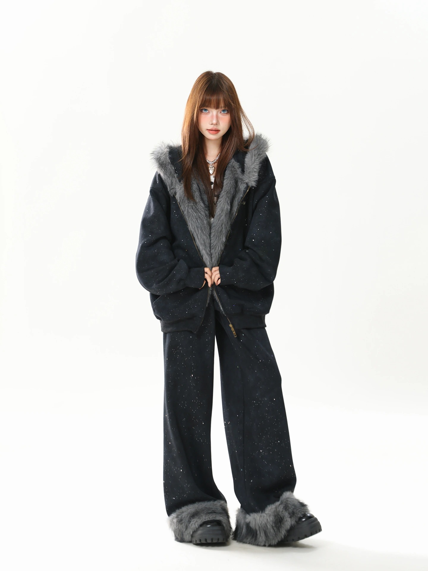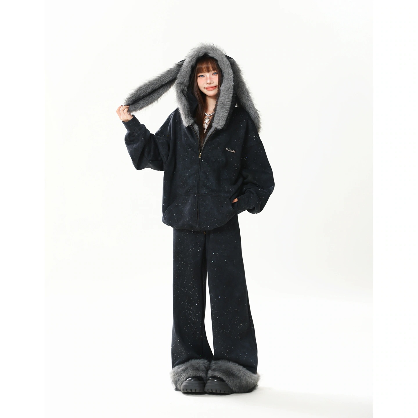 2025 秋冬ふっくら中綿裹起毛 ジャケット大きめ フード付き厚手防寒あったか柄アウター暖かい羽織るかわいいジップアップフェイクムートン長袖トレンド裏レトロサイズシルエット韓国ファッション耳レディース