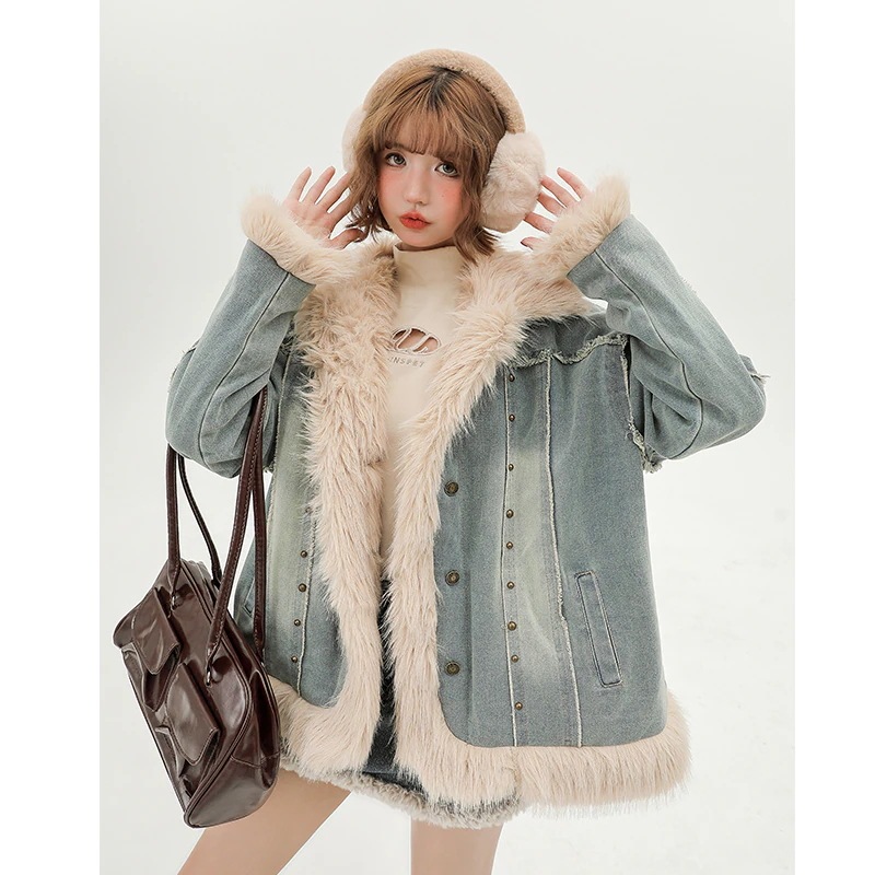 2025 秋冬ふっくら中綿裹起毛 ファー切り替えデニムジャケットレトロ厚手防寒あったかアウター 暖かい羽織るかわいいフェイクムートン長袖トレンド裏サイズシルエット韓国ファッション加工風レディース