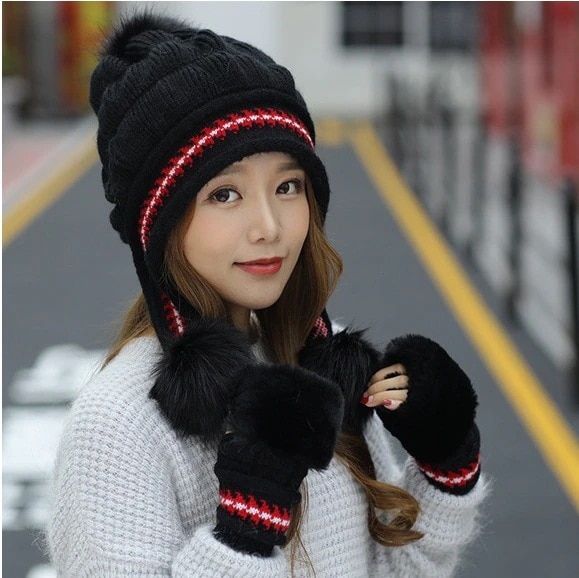 ウィンター プラス ベルベット 厚手のウールの帽子 女性の韓国風 ファッション 耳の保護 暖かい オールマッチ ニット手袋 包頭 かわいい