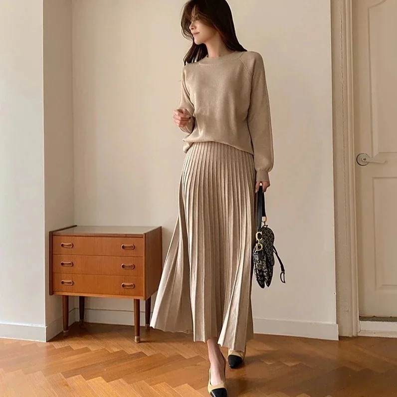 【店舗人気!】韓国人気 秋冬 ロングスカート セットアップ 二点セット カシミヤタッチ エレガントで高級で粋な 気質 無地 裏起毛スカート 百褶 スカート 垂れ感 着痩せ インナー 上下セット 通勤