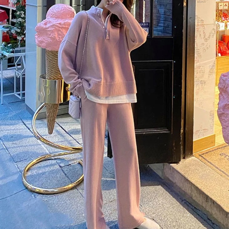 スポーツ セットアップ ニット 2点セット 上下セット ロングパンツ トップス パンツ 感 ワイドパンツ 体型カバー 着痩 スポーツウェア スウェット