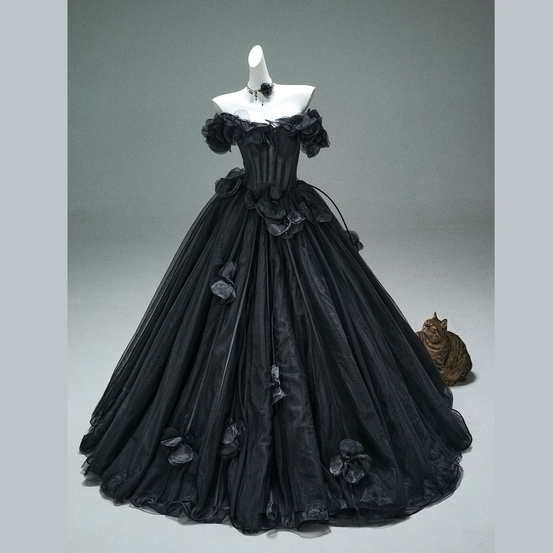オフショルダーのイブニングドレスエレガントな黒学生卒業式プリンセススタイルのチュールスカート成人式に適しています