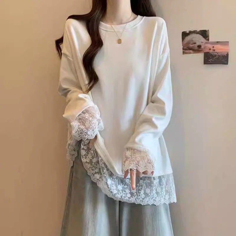 【人気新作】【新デザイン登場】レース切り替えチュニックトップス レーストップス オーバーサイズ レース トップス 裾レース 袖レース カットソー 長袖 レディース レイヤード 大きいサイズ ロンT