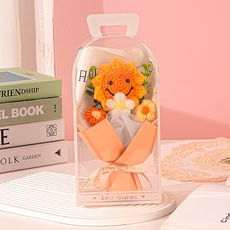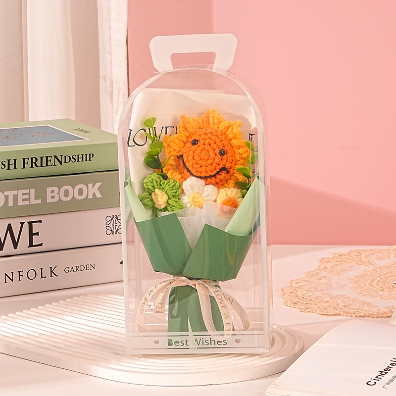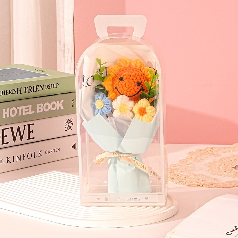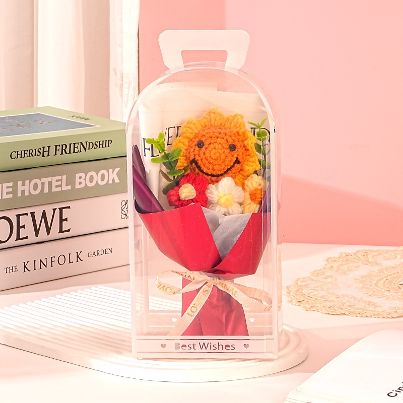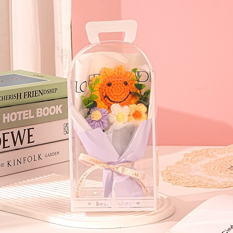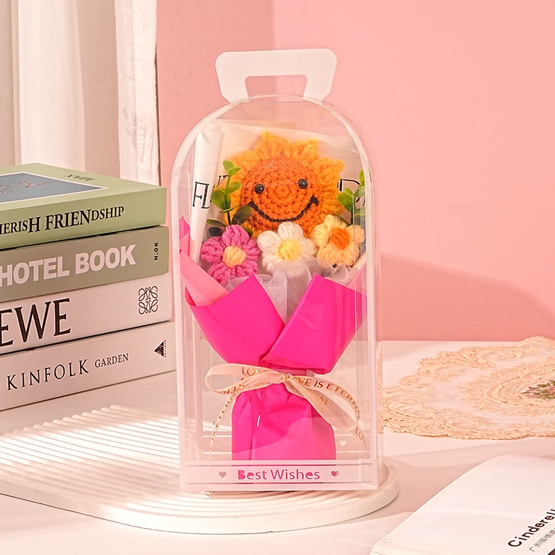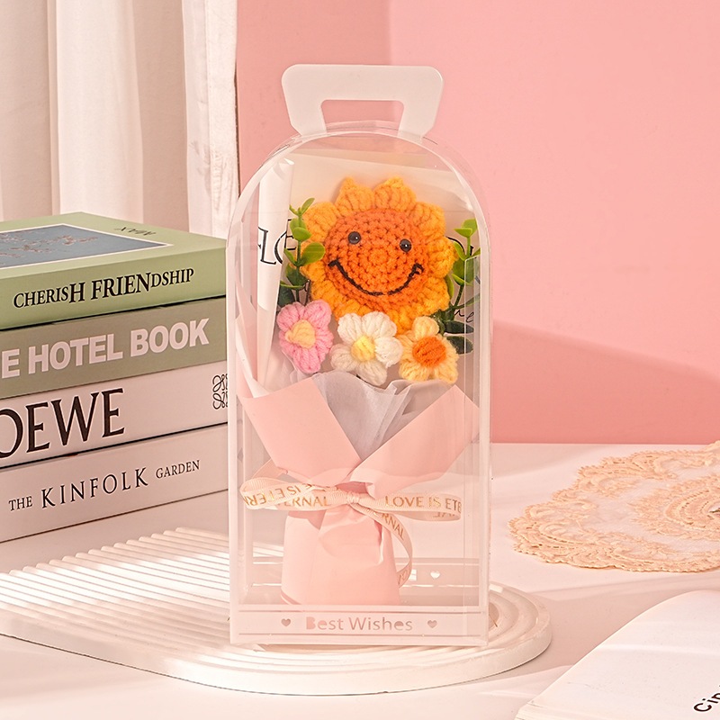 独占販売卒業シーズン贈り物 教師の日ギフト手作りニットフラワーひまわりスマイリーフェイスウールブーケpvcギフトボックス卒業シーズンギフト2つの方がお得です