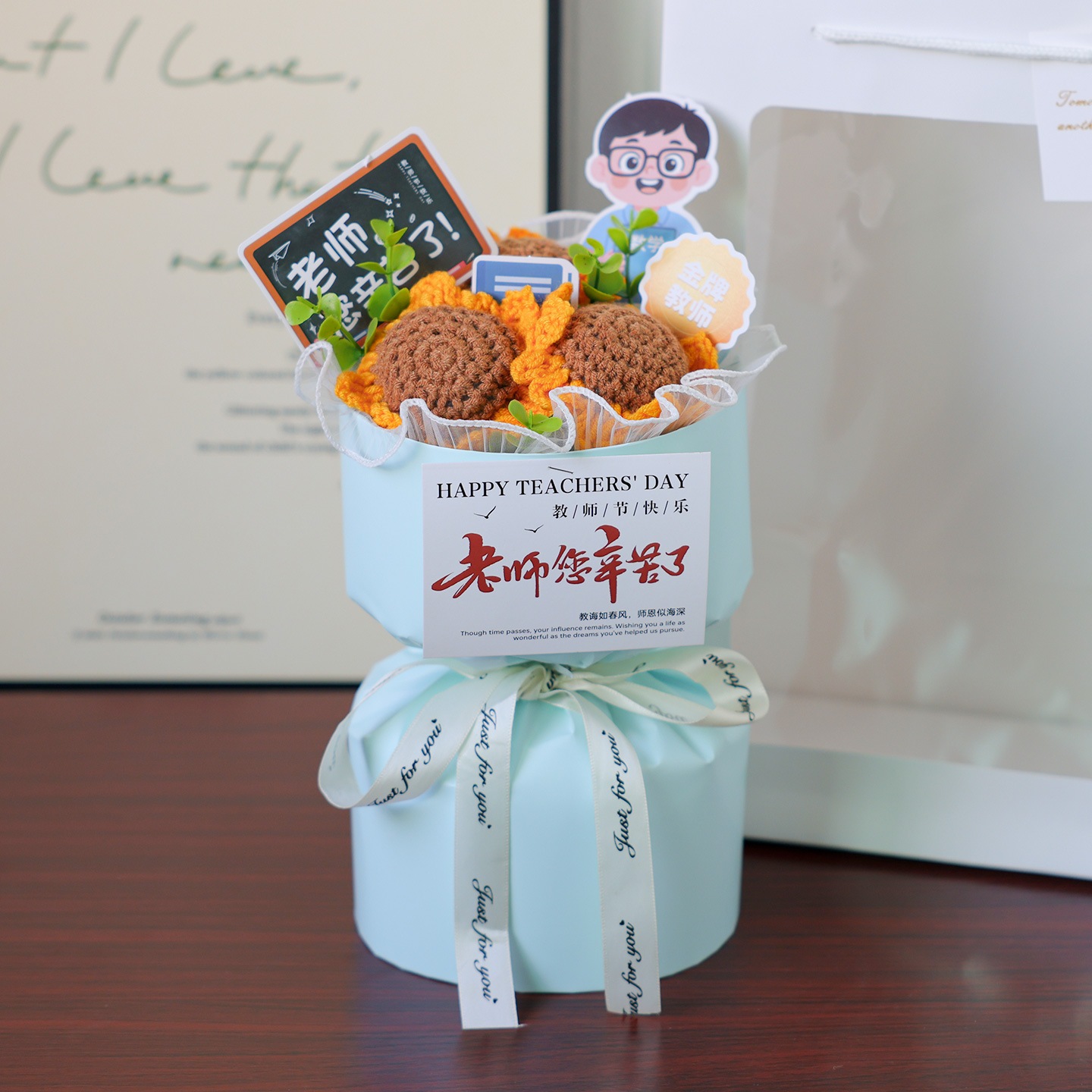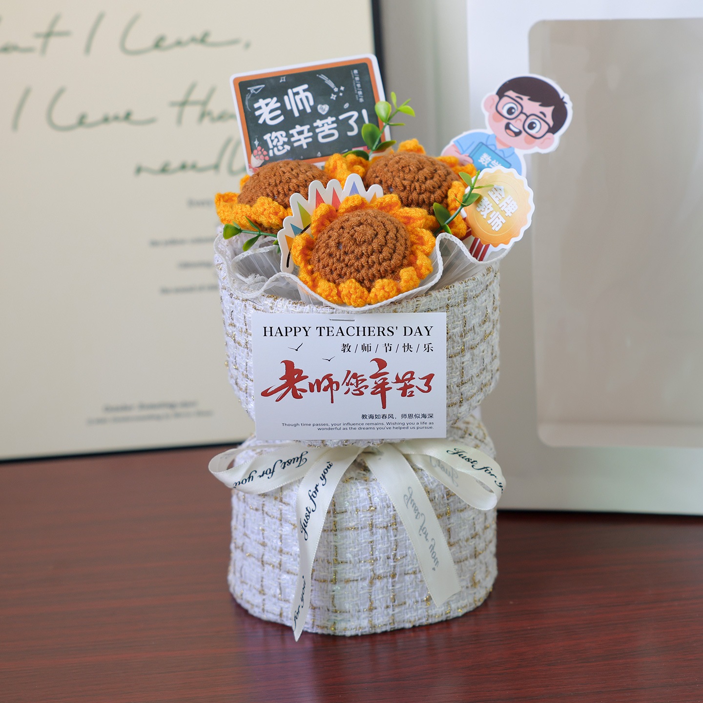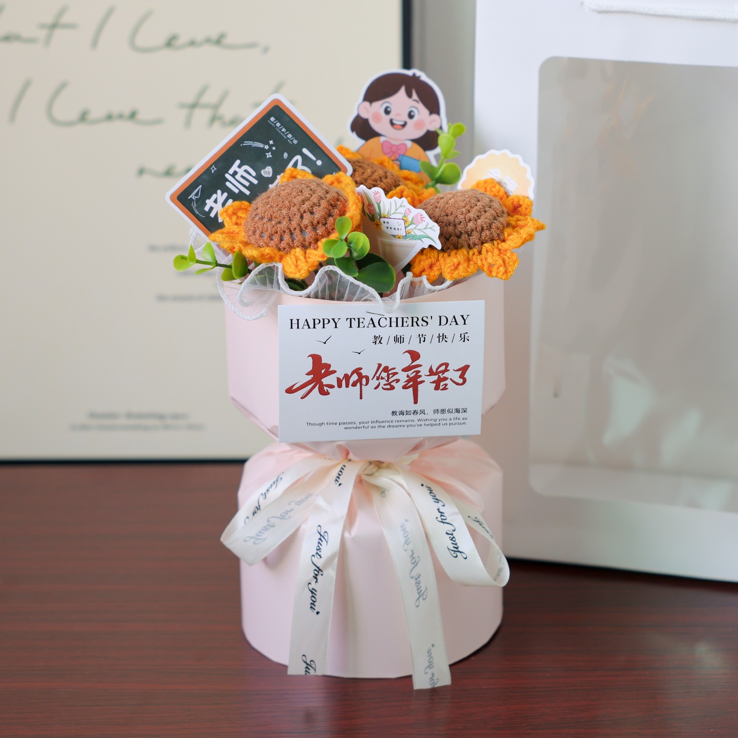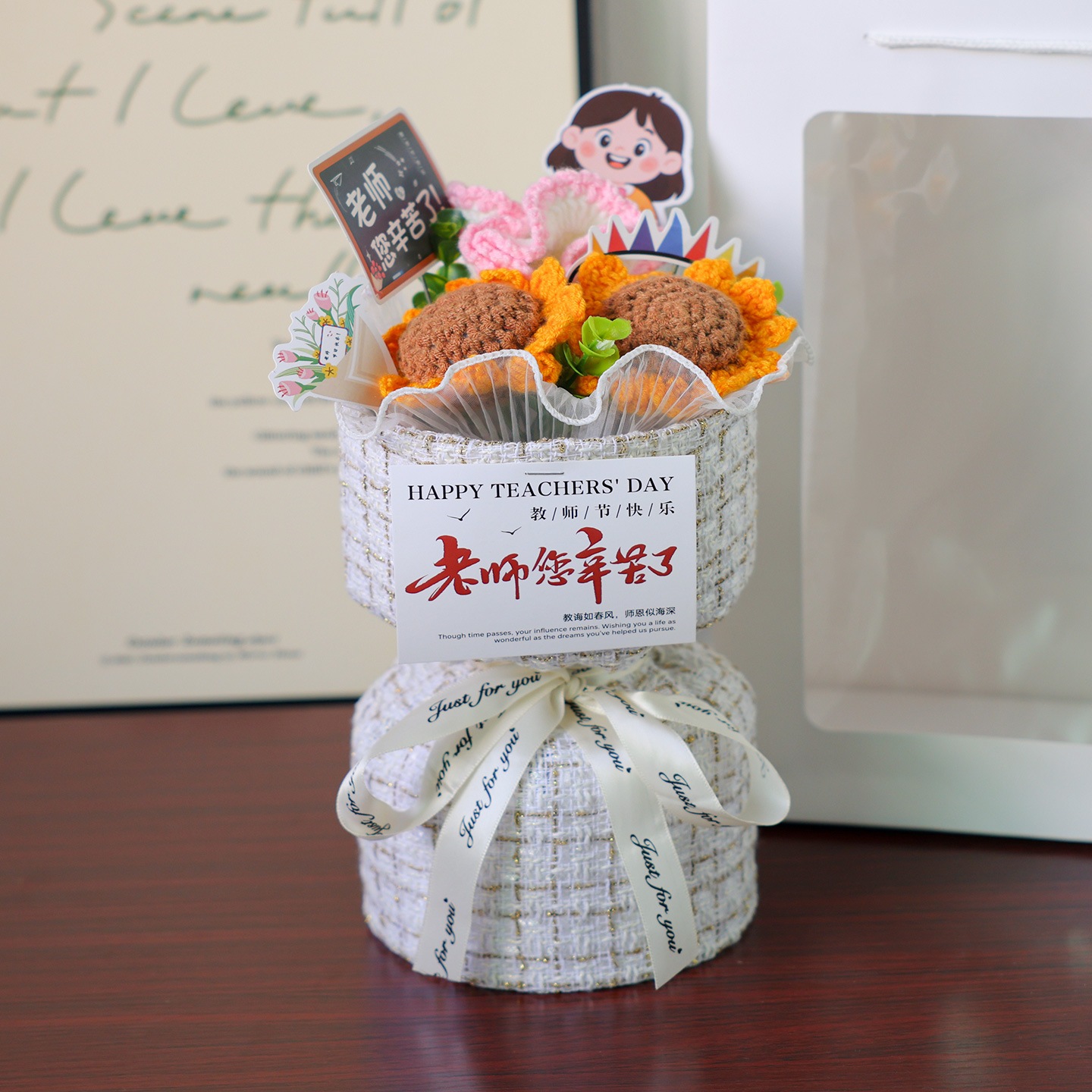 独占販売卒業シーズン贈り物 幼稚園の初めに男性教師と女性教師への女性の日の贈り物として手作りのひまわりウールの編みブーケ2つの方がお得です