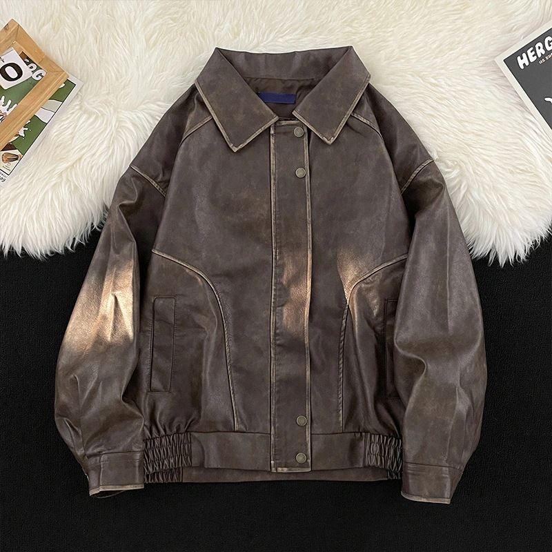 アメリカンレトロ風ヴィンテージ加工レザージャケットメンズ ストリート系 ワイルドでクール 高級感あるバイカージャケットメラドブラウンレザージャケット