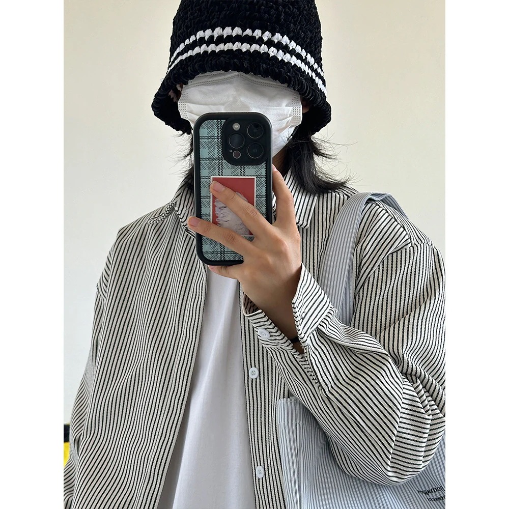 青と白のストライプシャツ春秋用メンズ和風レトロインナーとして重ね着ゆったり着回しカップル用カラーアウター
