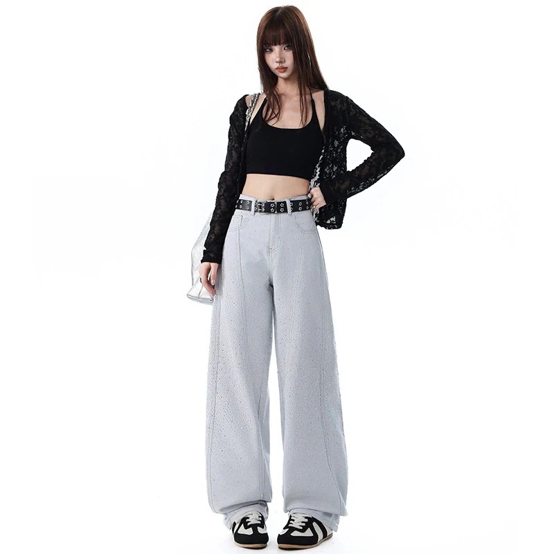 【3日出荷】スタースパンコールデニムパンツ サイドライン身長アップデザイン ルーズ着痩せ フロアグラーズモデル 秋季 ズボン 春服 レディース