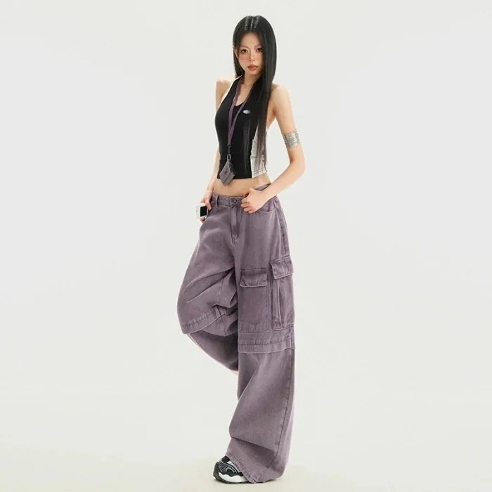 【3日出荷】ワークスタイルデニムワイドパンツ ムラサキ色ロング丈 フロアグラーズモデル 秋季 ズボン 春服 レディース