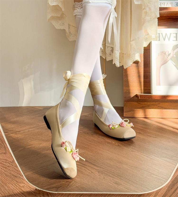 INSスタイル フラット底バレエシューズ 女性用 2026新作 ローズフラワーで可愛らしさアップ クロスストラップ設計 2色から選べ 大きいサイズ対応 日常使いに実用的で おしゃれな造型を演出