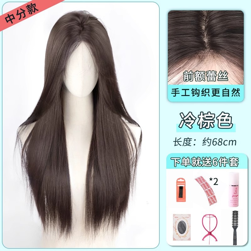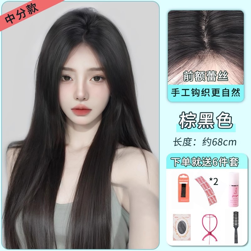 ウィッグ全頭セット女性ロングヘアー前額レース黒ロングストレート自然シミュレーション日常整頂ストレート頭頂中分