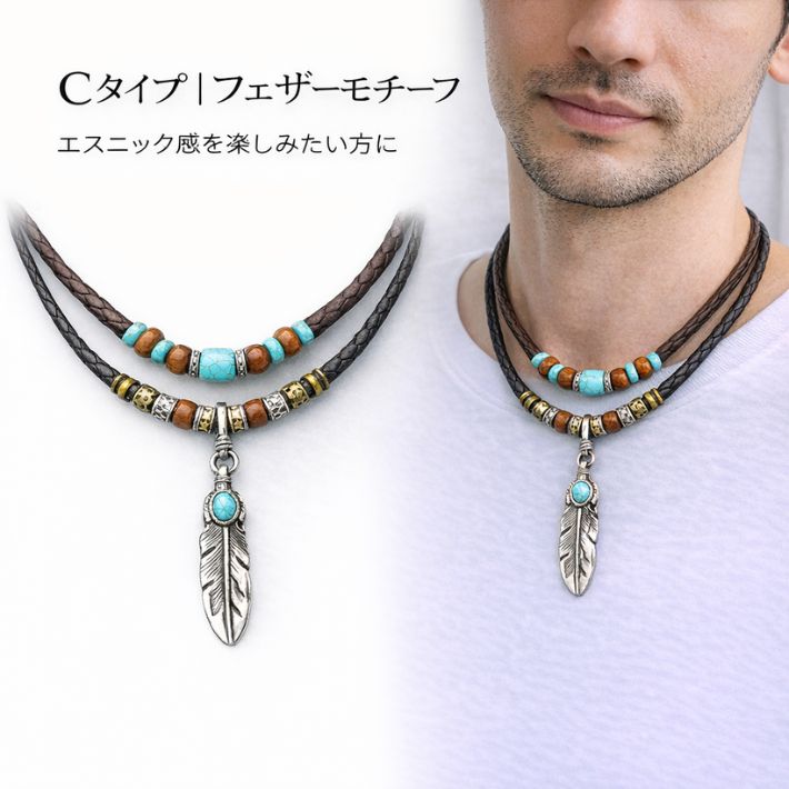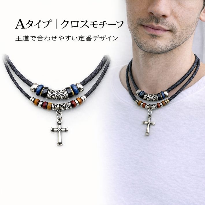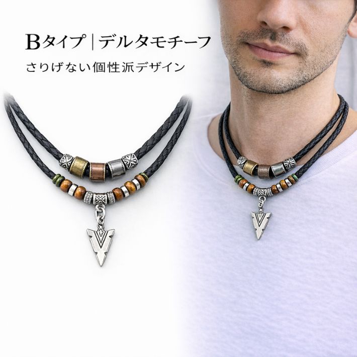 ネックレス メンズ ダブルレイヤー 2連 エスニック クロス デルタ フェザー 重ね着け風 PUレザー ビーズ レイヤード 大人カジュアル 30代 40代 男性 おしゃれ アクセサリー プレゼント ギ
