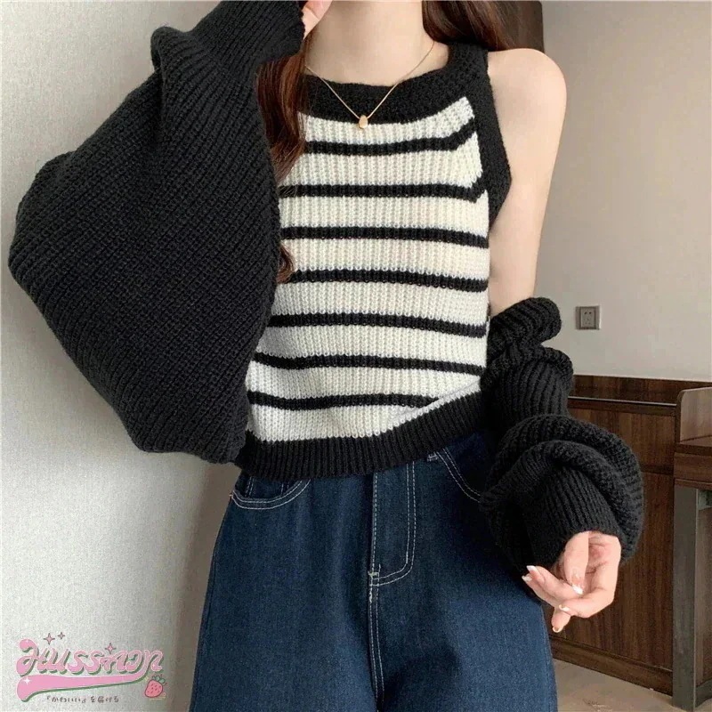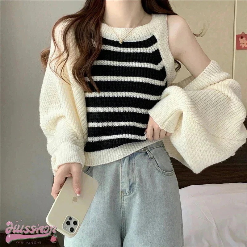 韓国抜け感が可愛い 2枚 トップス ニット セーター レディース 長袖 ゆったり かわいい カジュアル きれいめ スリーブ 夏 羽織り ファッションきれいめ 大人っぽ ショートタンクトップカジュアル秋