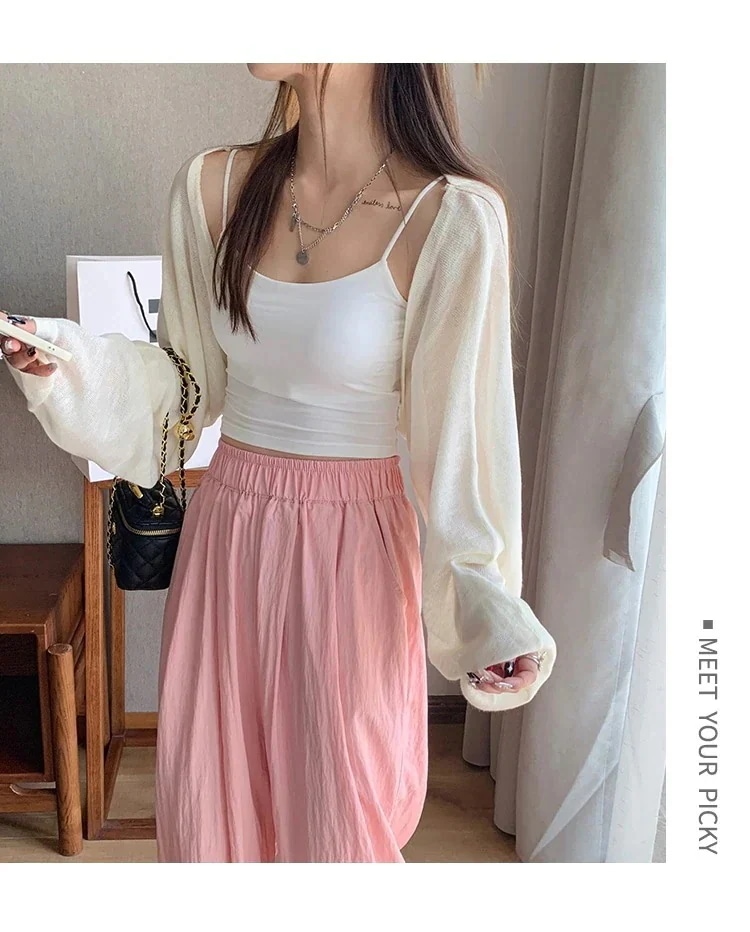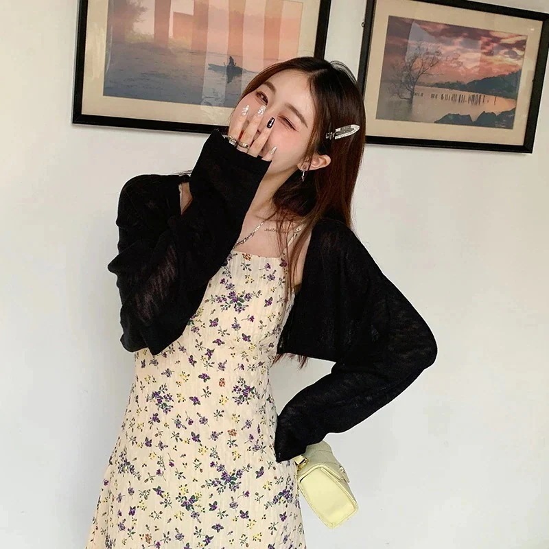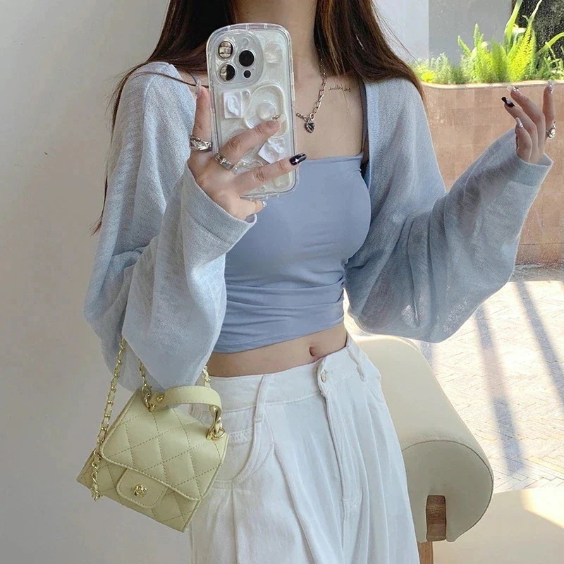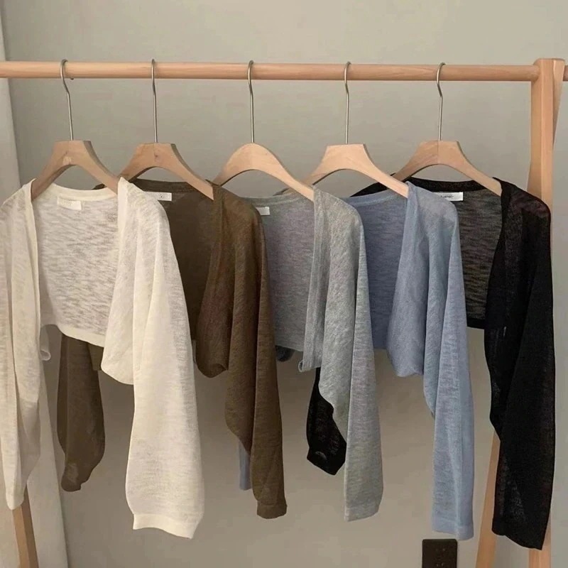 2025 春夏 韓国 ショート丈 薄手 カーディガントップス 長袖 紫外線対策 レディース UVカット 冷房羽織り加工きれいめ透けニット オフィスOLネックカジュアル ファッション韓国