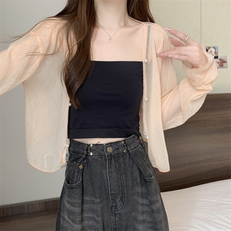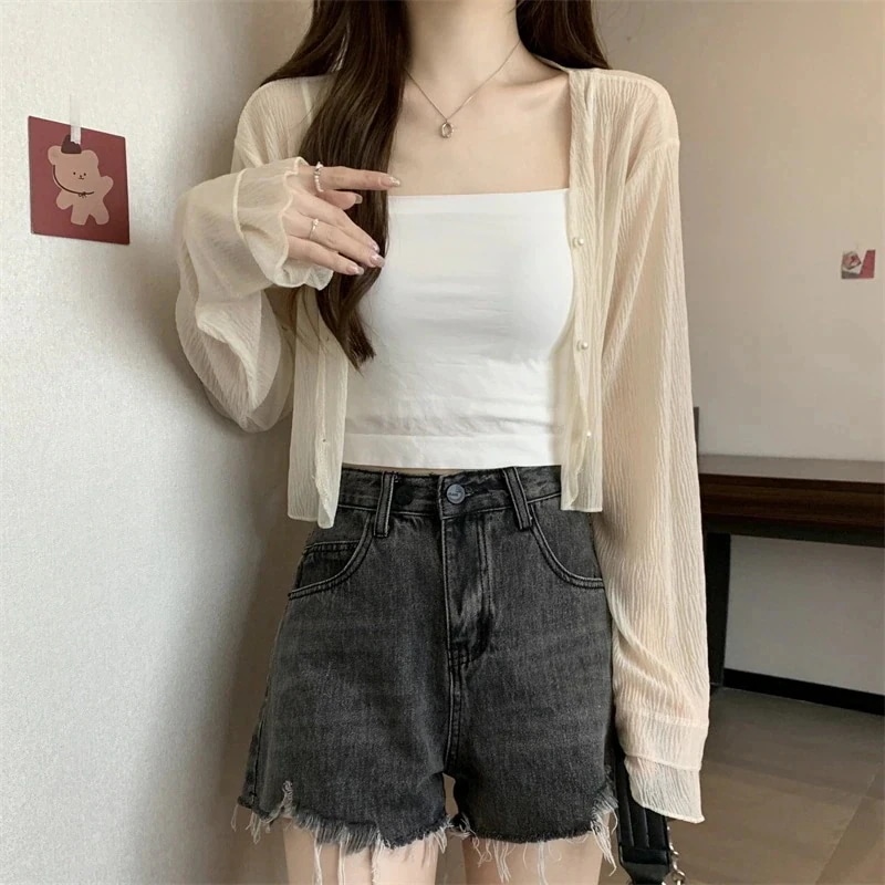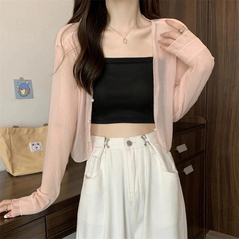 2025 春夏 韓国 ショート丈 薄手 カーディガントップス 長袖 紫外線対策 レディース UVカット 冷房羽織り加工きれいめ透けニット オフィスOLネックカジュアル ファッション韓国