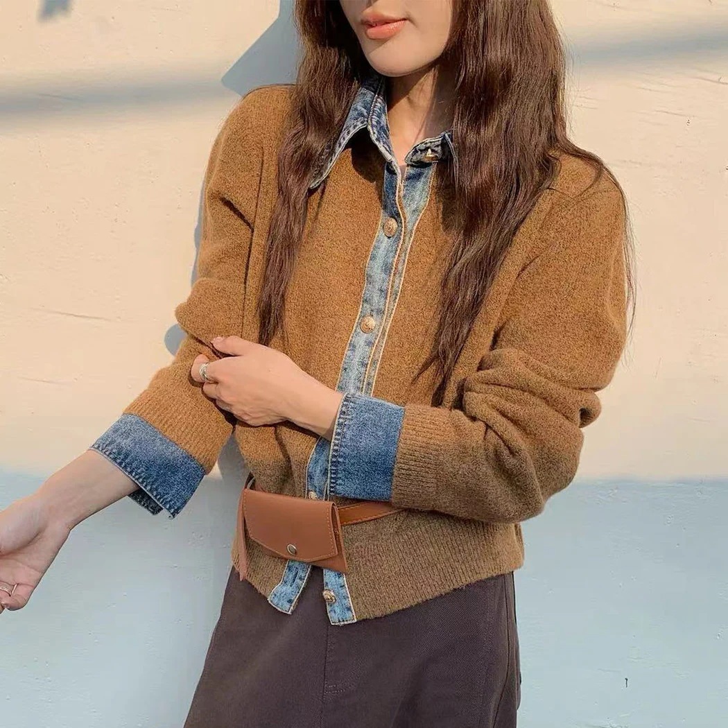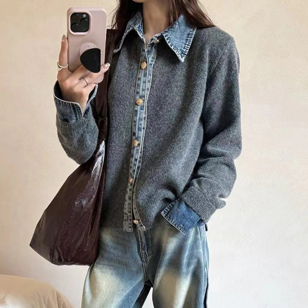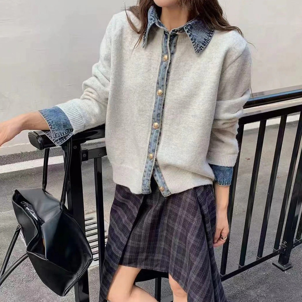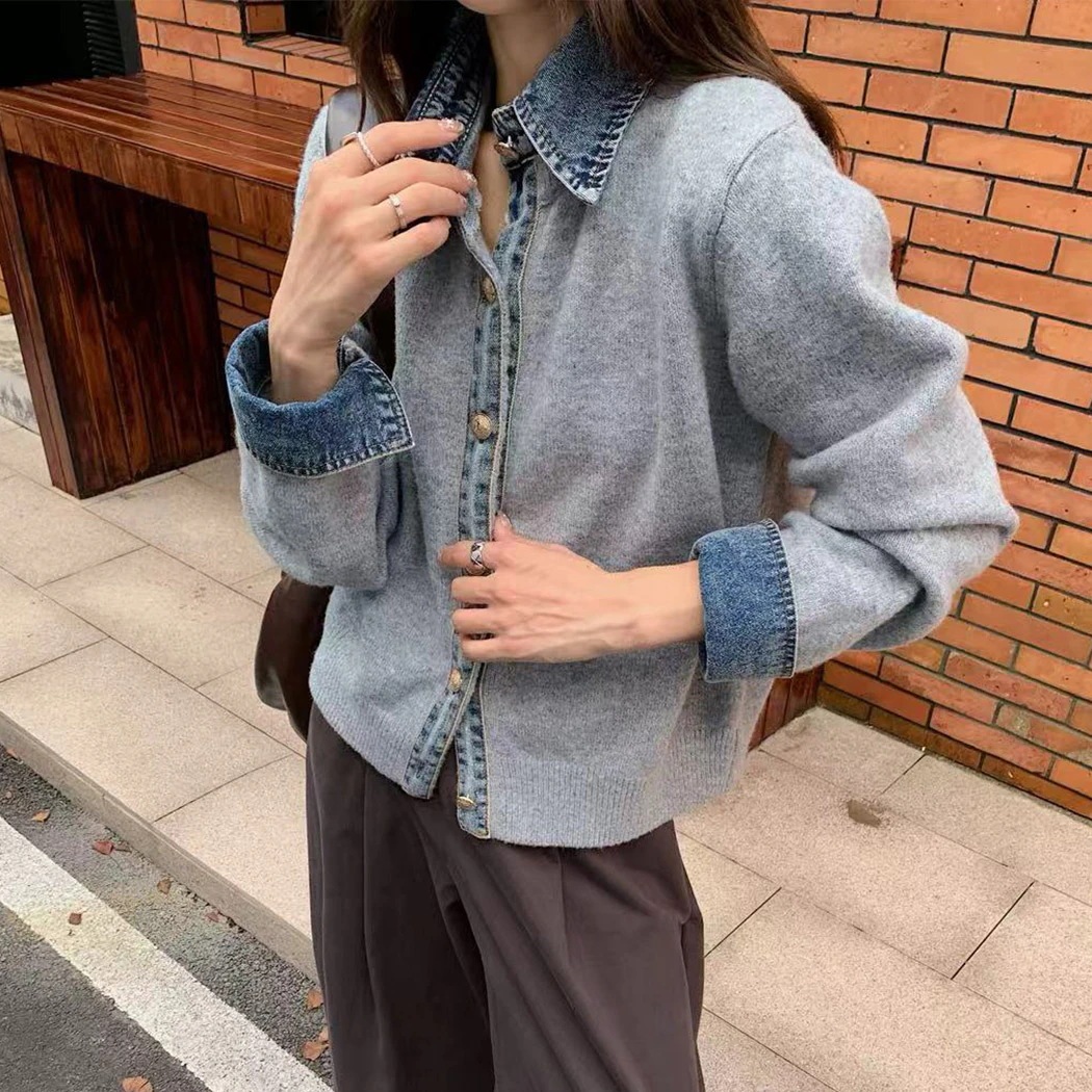 短納期 カーディガン ニット デニム 切り替え ドッキングデザイン リブ レディース トップス 長袖 防寒 保温 羽織 レギュラーカラー 前開き