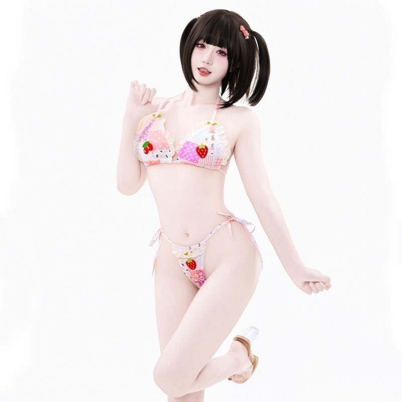 【3日出荷】パッチワークプリント セクシーギャル 寝衣着 三点式 ストラップビキニ ピンク