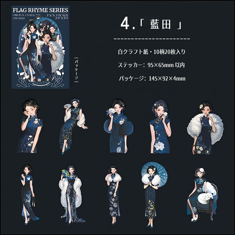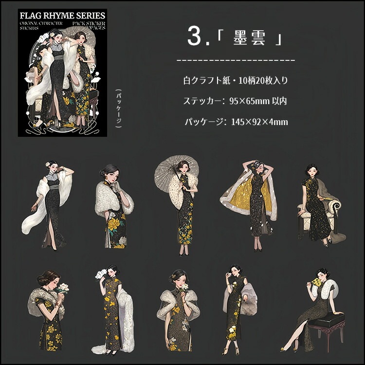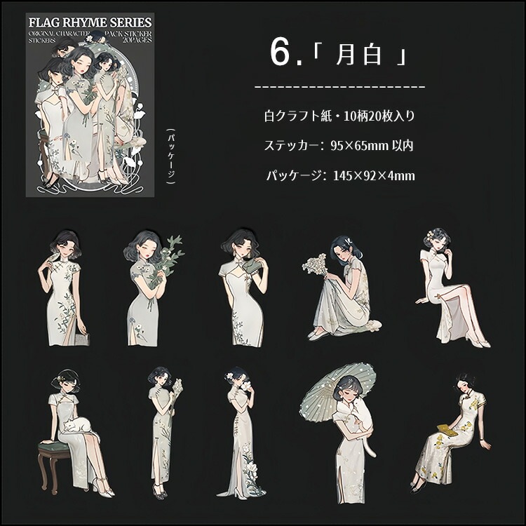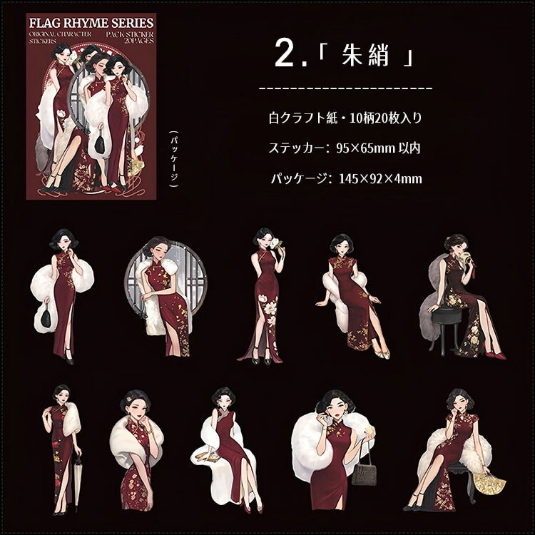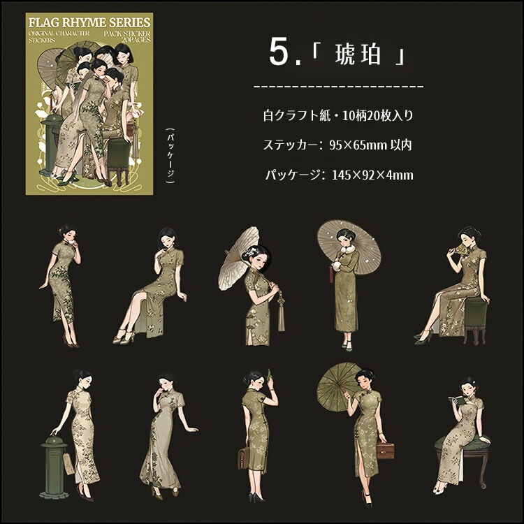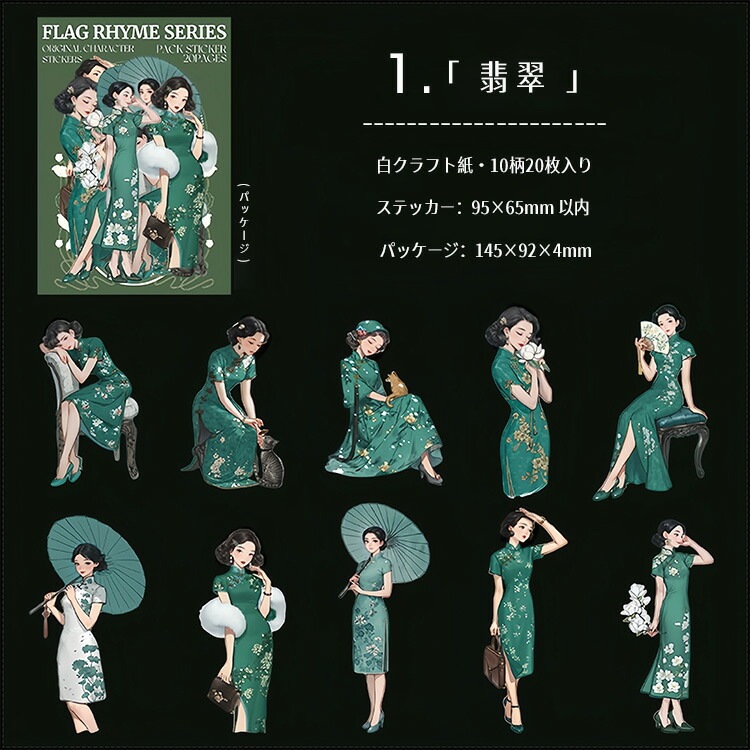 余白なし 人物シール 透けない 大きめ 20枚 翡翠カラー チャイナドレス かさ さす人物シール フレークシール 女の子 レトロ 中華 クラシック 上品 大人 コラージュ素材sztz-20-298