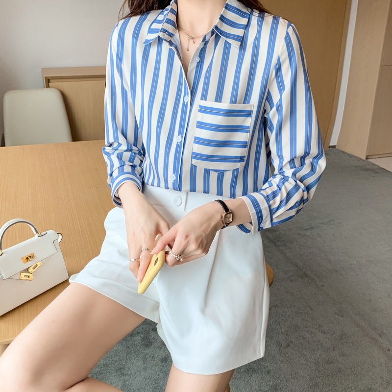 洋気秋新型婦人服はストライプシフォン上着カーディガンシャツをめくります