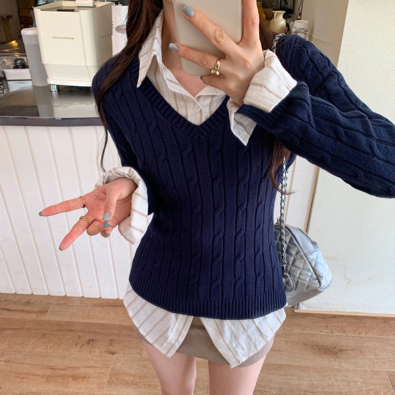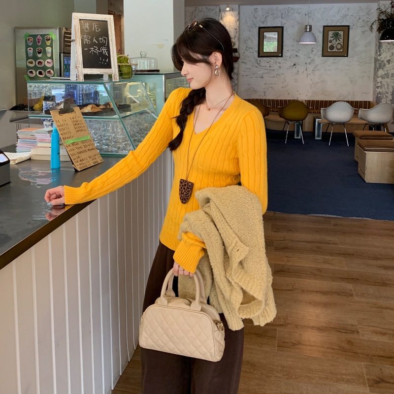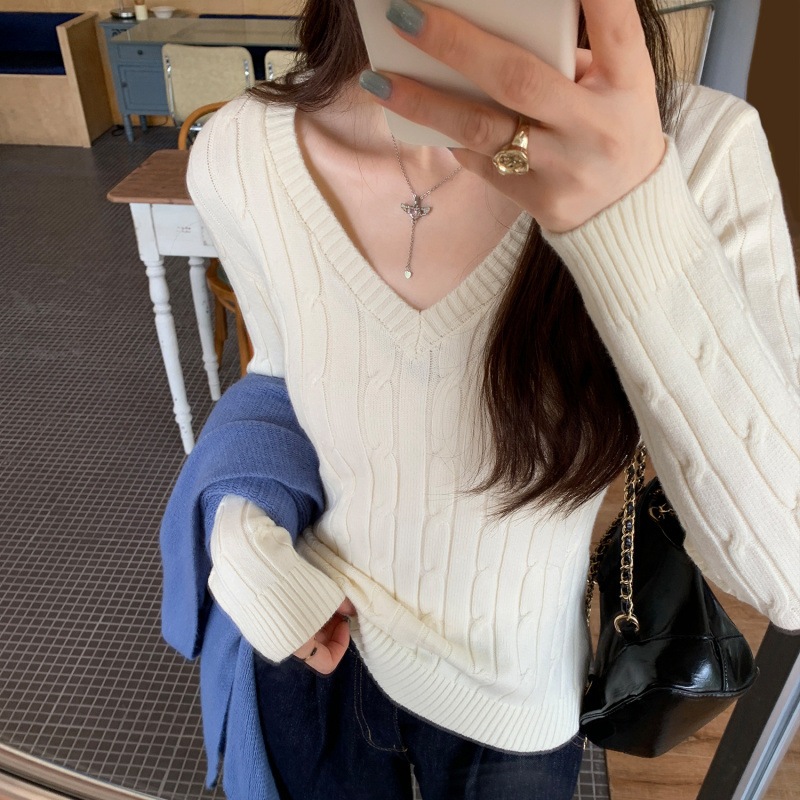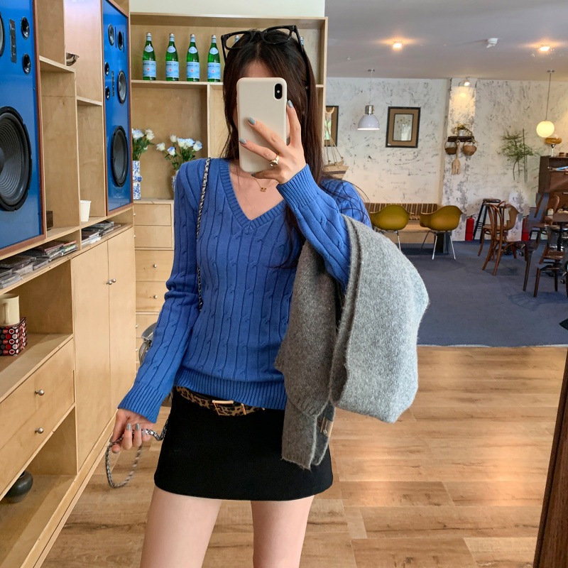 4色韓国美しい青い麻花vネック長袖ニット女性秋新型内は底上着を掛けます