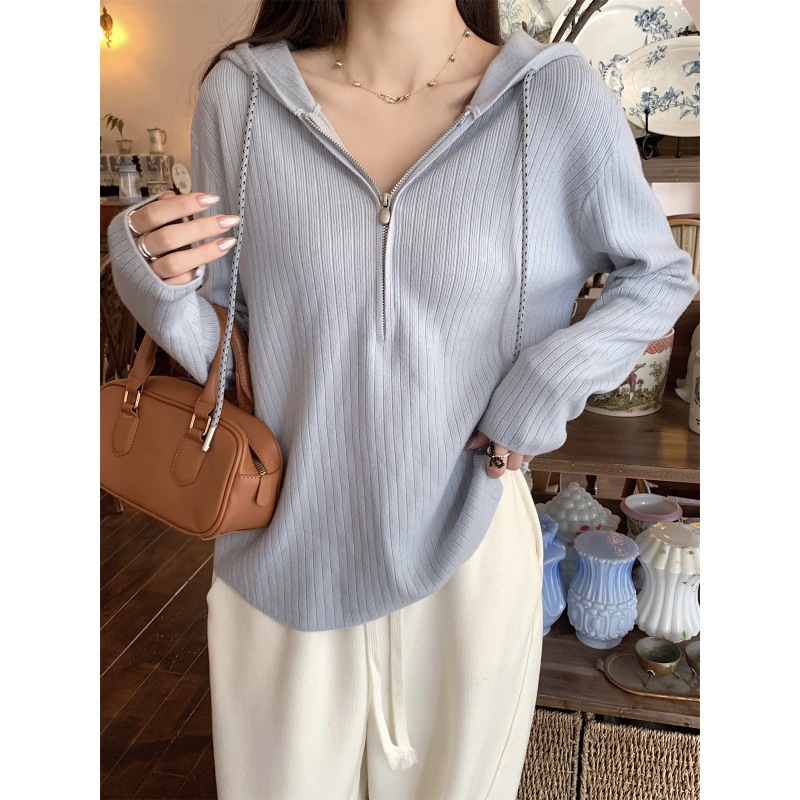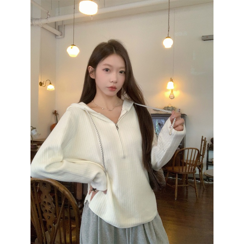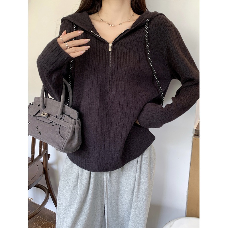 秋冬韓国百合帽子付きジッパーカーディガン