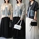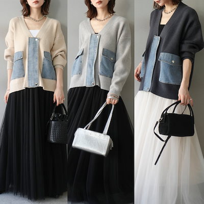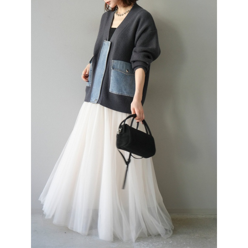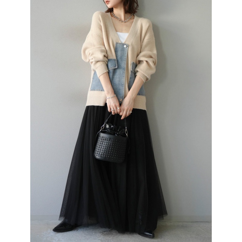 3色韓国秋冬ニットステッチデニムカーディガンジャケット純色ネット糸半身ロングスカート2点セット