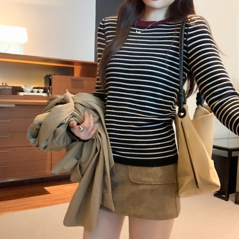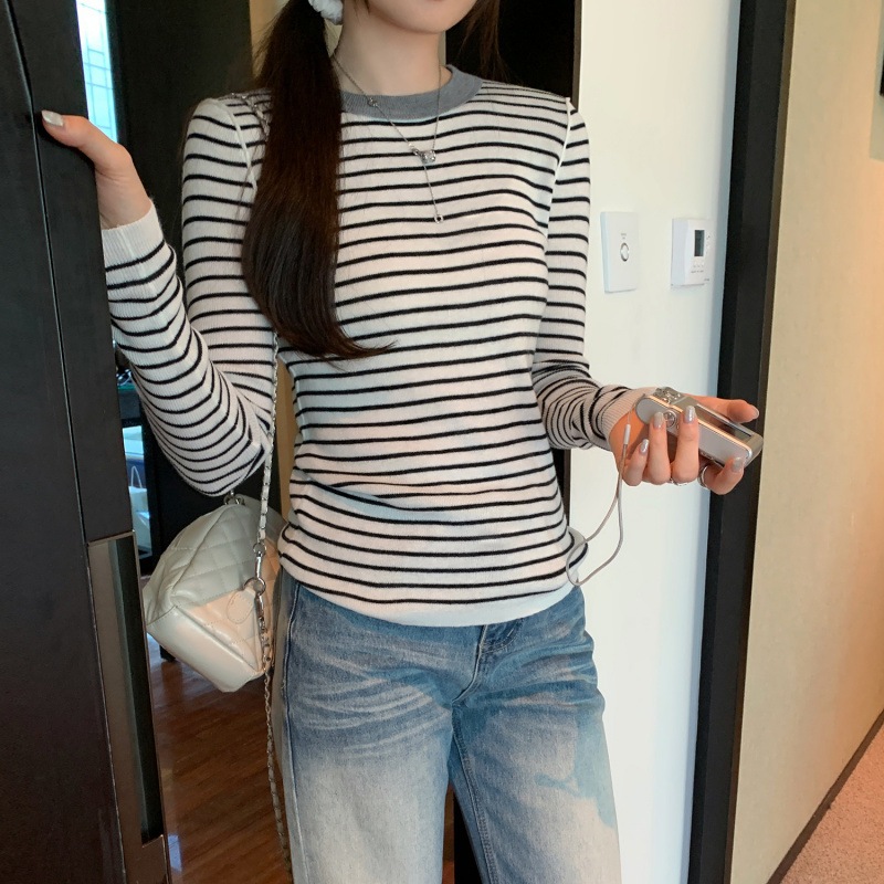 韓国軽熟ストライプ丸首長袖ニット女性新型早秋超美しいシングルは気質上着を着ます