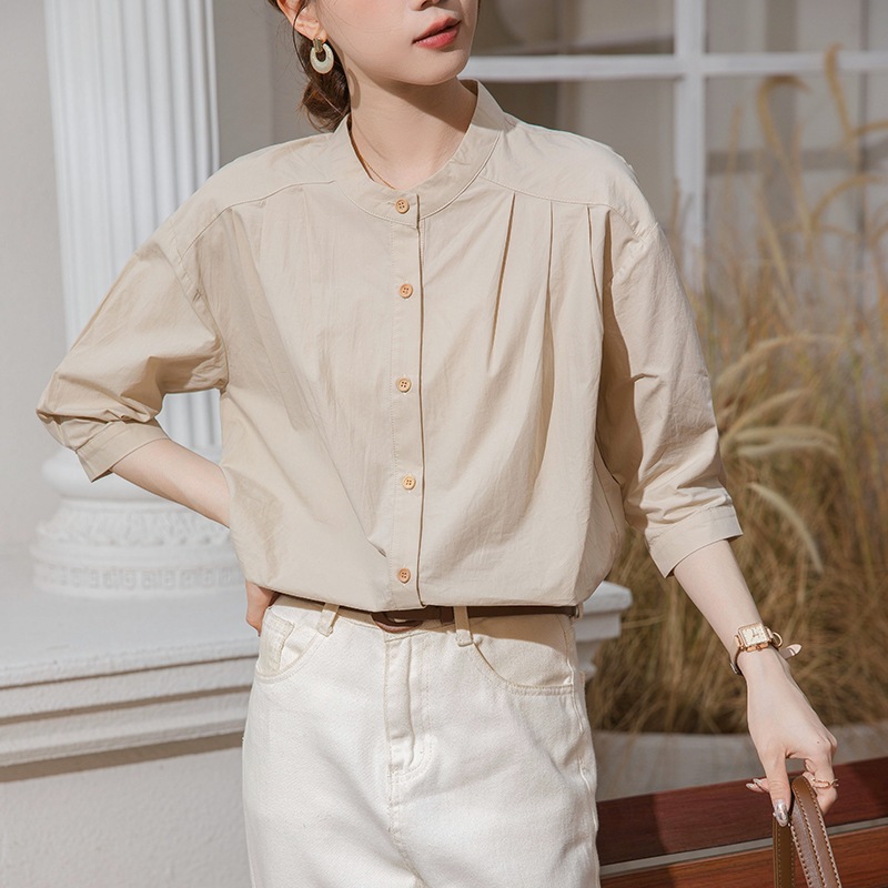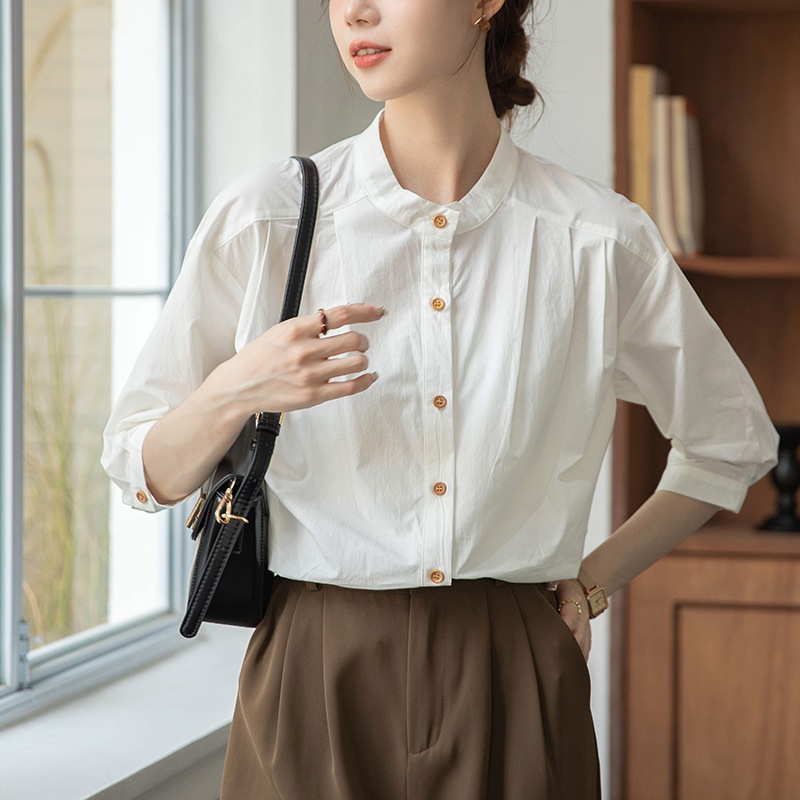 2色韓国新しい丸首白い七分袖シャツ女性夏百合気質カジュアルでゆったりしていてやせている上着が見えます