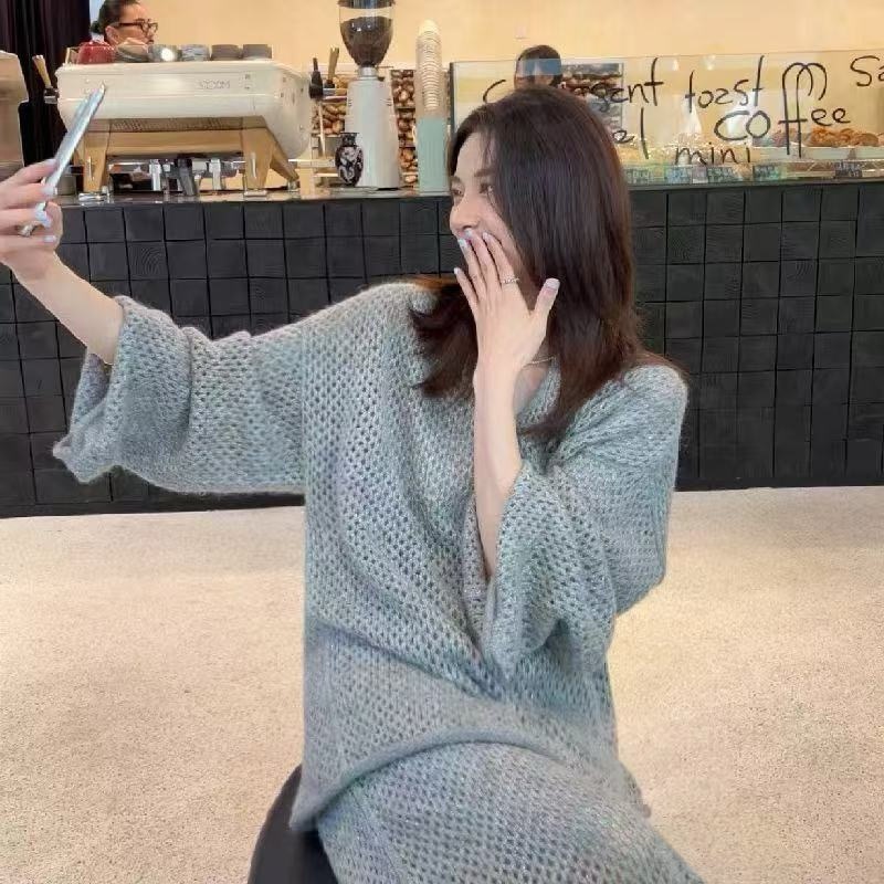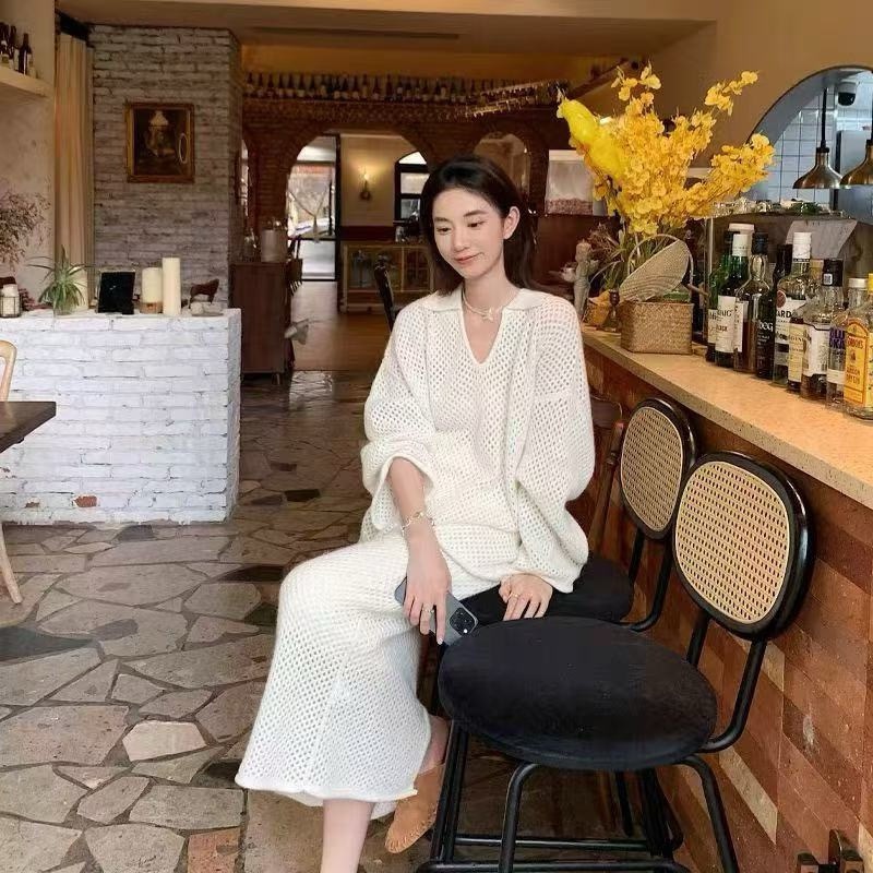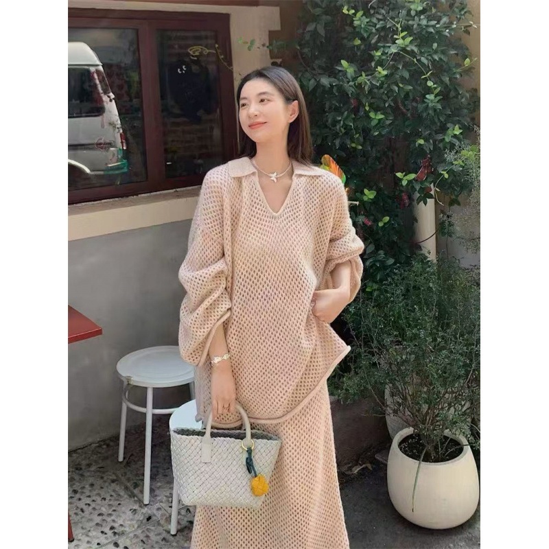 3色韓国新型ラクダ毛怠惰なニット女性vネック透かし彫り気質はフォーク半身スカート2つセットを開きます