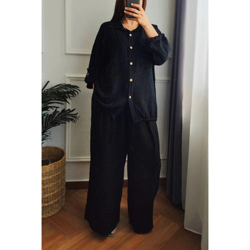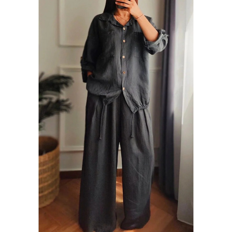 6色5ヤード中東春秋ゆるい綿麻純色シャツボタンワイドパンツ2点セット女性