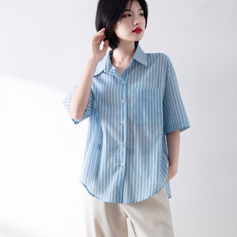 韓国青と白ストライプ半袖シャツ女性夏は亜麻シャツフランス式怠惰な感じ上着を着ます
