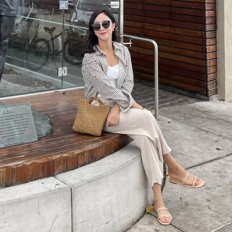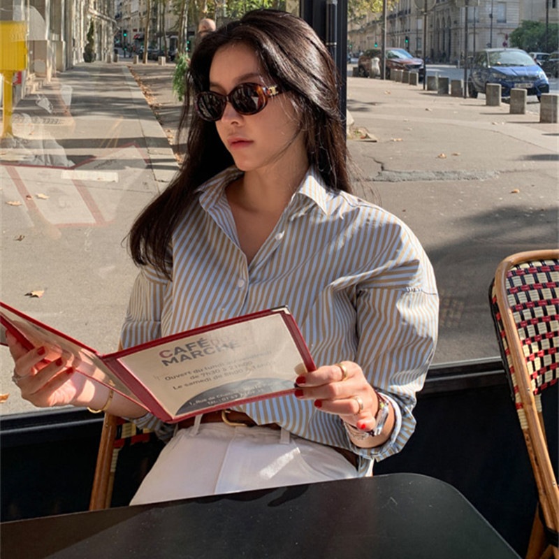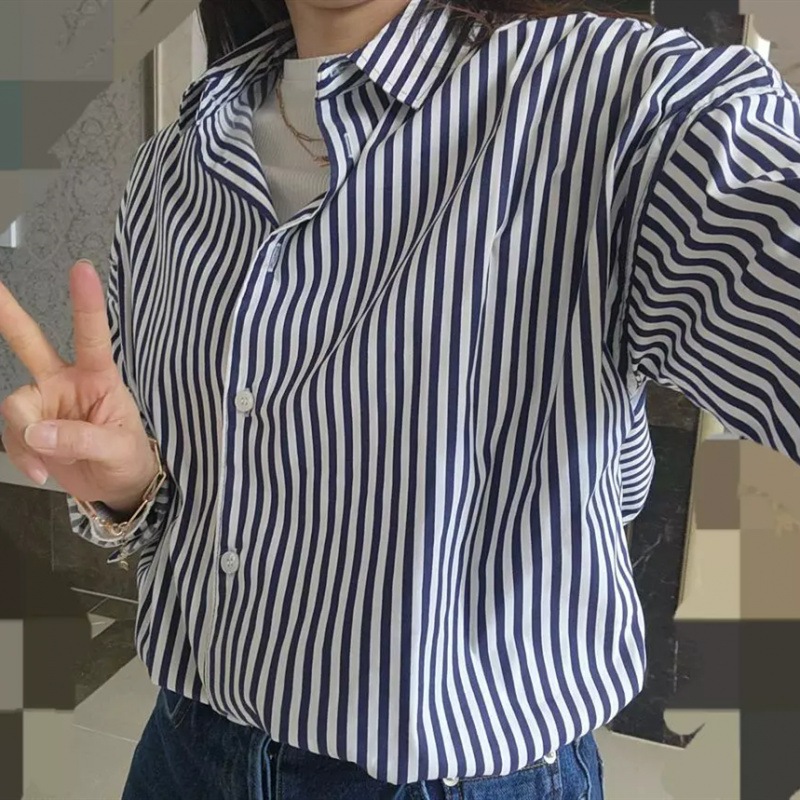 3色韓国pol襟抗シワ縞綿混紡カジュアルシャツ女新倒肩長袖百合シャツ