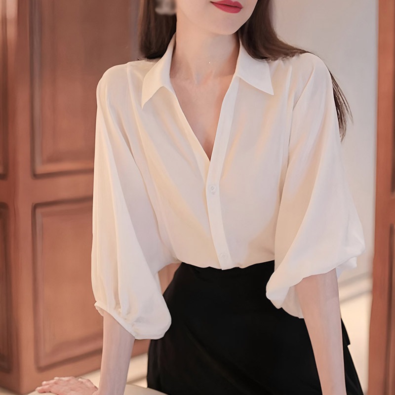 韓国気質シフォン肩袖シャツ女性夏薄いタイプデザイン感小さい衆ゆったりしているシャツ半袖独特な上着
