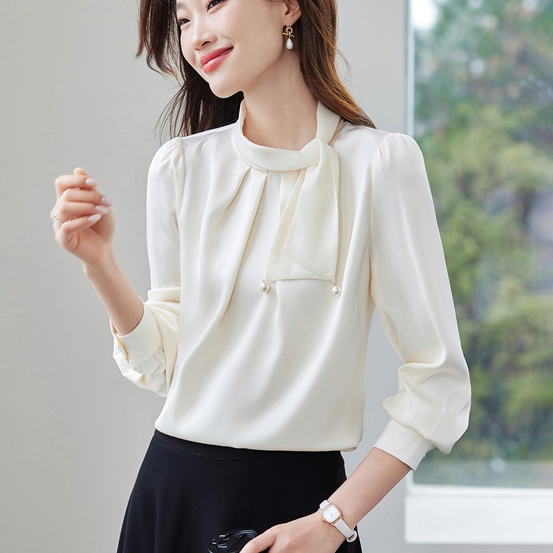 2色優しい襟元蝶結びシャツ女性春新しいサテン垂れ下がった感じ職業通勤上着